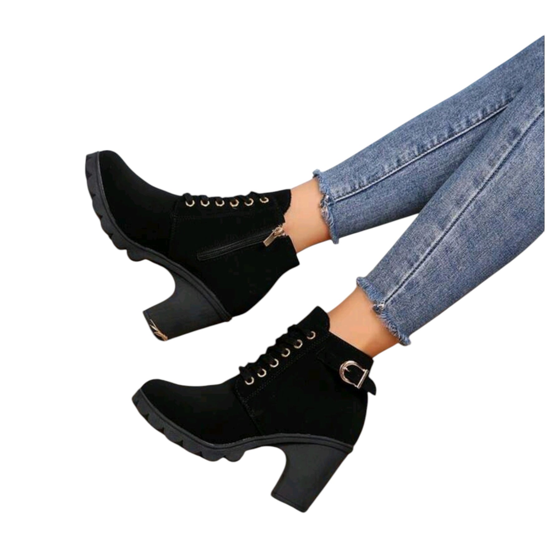 Címke nélküli, fekete, fűzős, vastag sarkú bokacsizma, cipzárral az oldalán, arany színű fém kiegészítőkkel. Belső talp hossz: 25cm