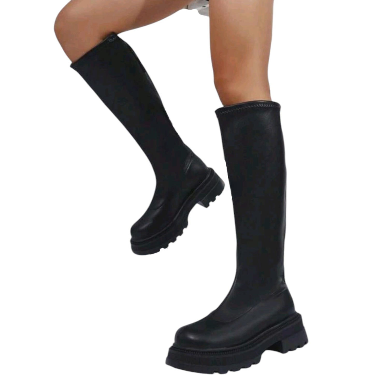 Címke nélküli, fekete, platform talpú, térdig érő csizma, vastag bordázott talppal. Belső talp hossz: 24,5cm