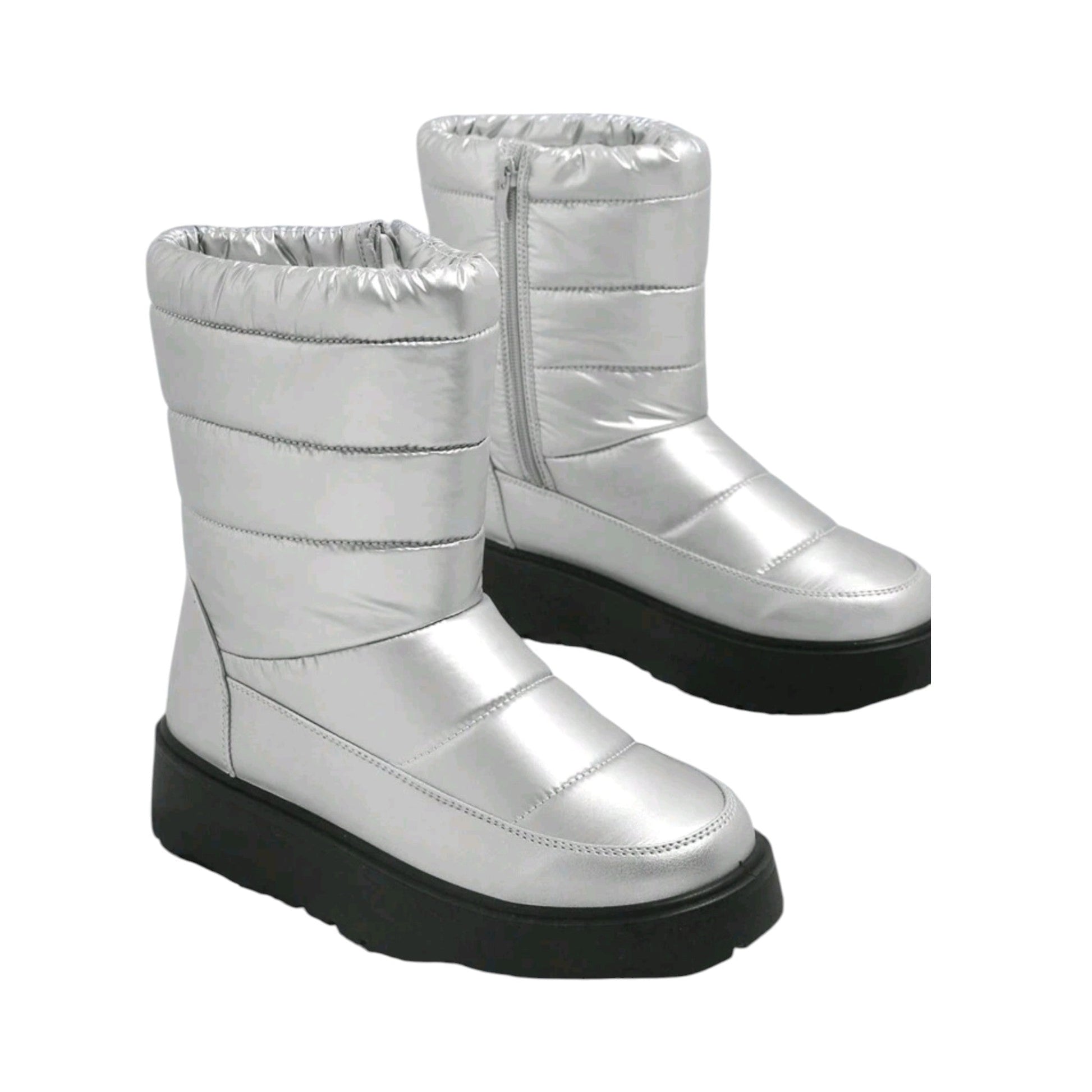 Címke nélküli, ezüst, steppelt, vízálló hatású, vastag talpú rövid szárú csizma, oldalt cipzárral. Belső talp hossz: 22cm