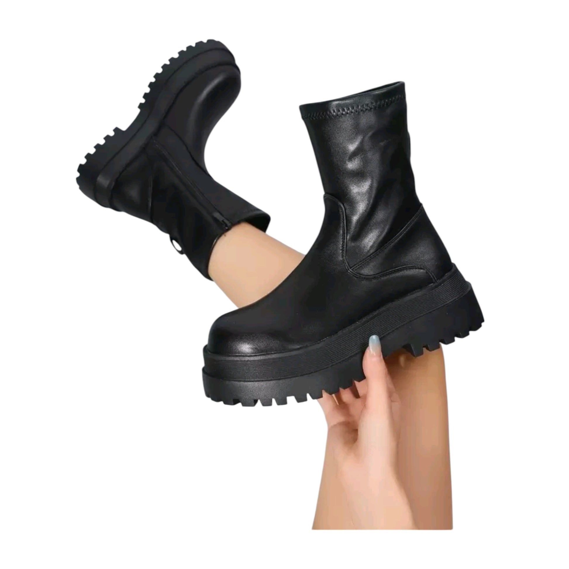 Címke nélküli, fekete, műbőr/bőr hatású, platformos, vastag talpú, cipzáros. Belső talp hossz: 22,5cm