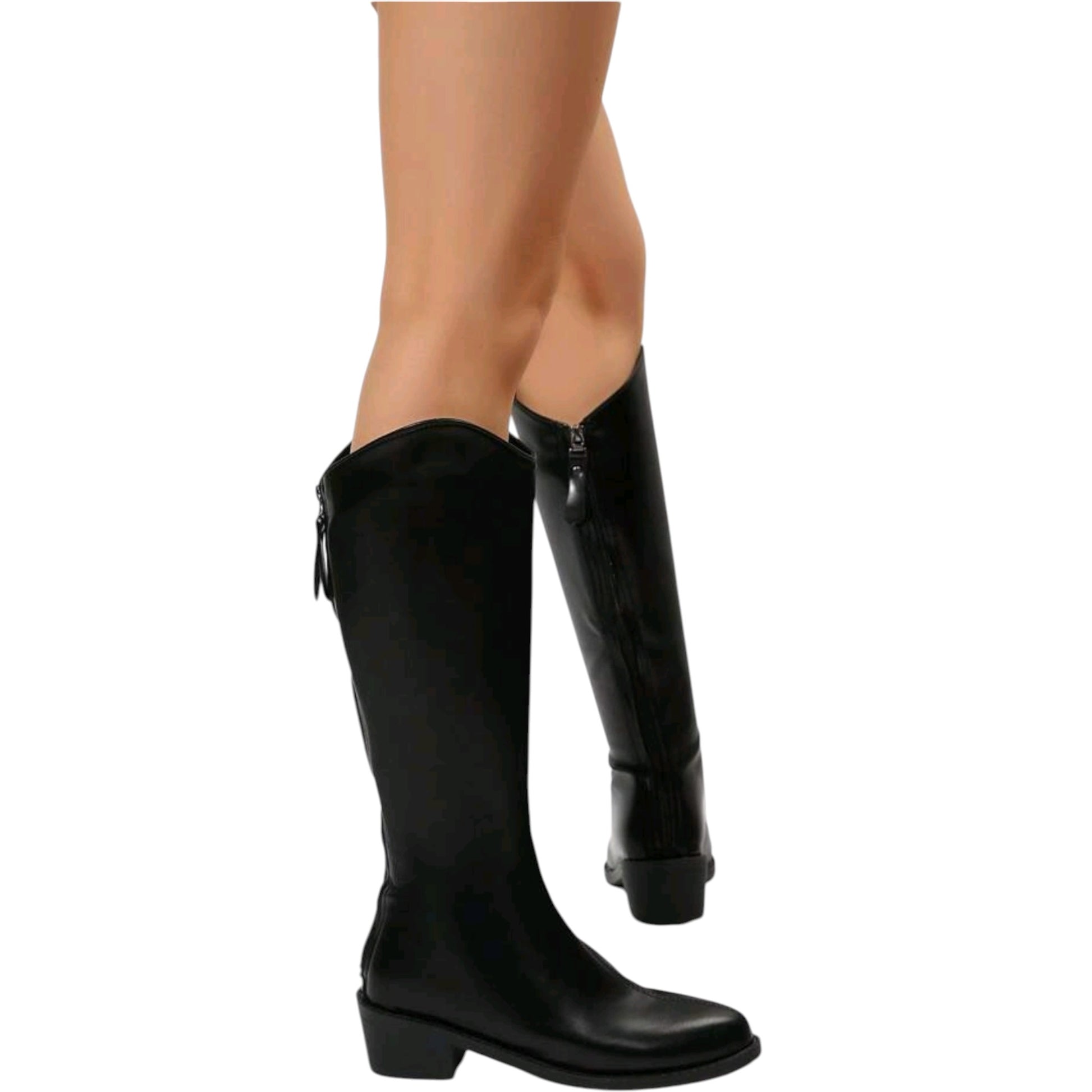 Címke nélküli, fekete, műbőr/bőr hatású, kerek orrú, alacsony sarkú, cipzáros. Belső talp hossz: 25cm