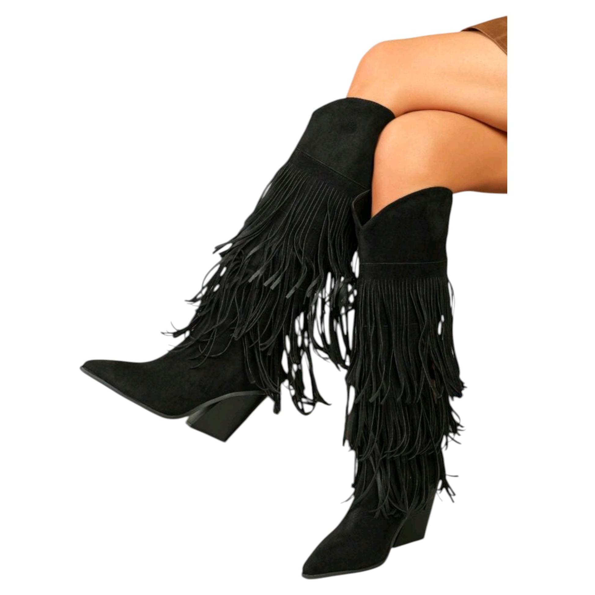 Címke nélküli, fekete, műbőr/bőr hatású, hegyes orrú, vastag sarkú, rojtokkal díszített. Belső talp hossz: 26cm