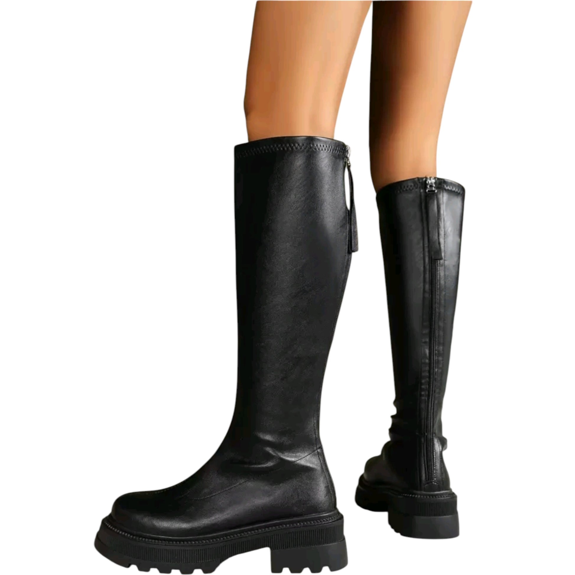 Címke nélküli, fekete, műbőr/bőr hatású, platformos, vastag talpú, cipzáros. Belső talp hossz: 22cm