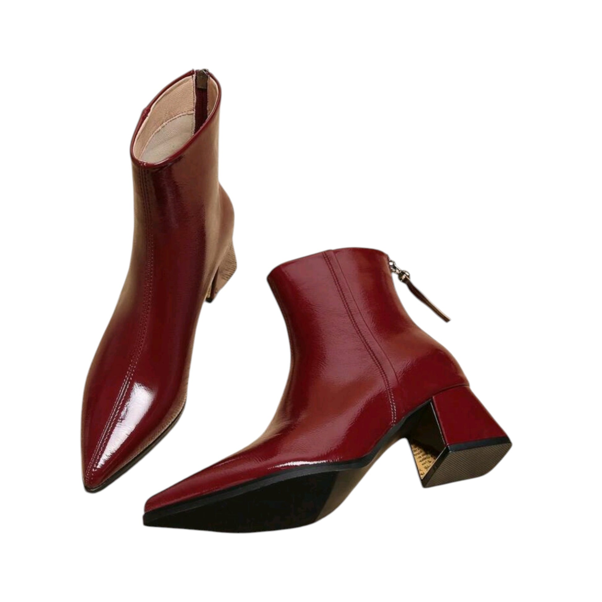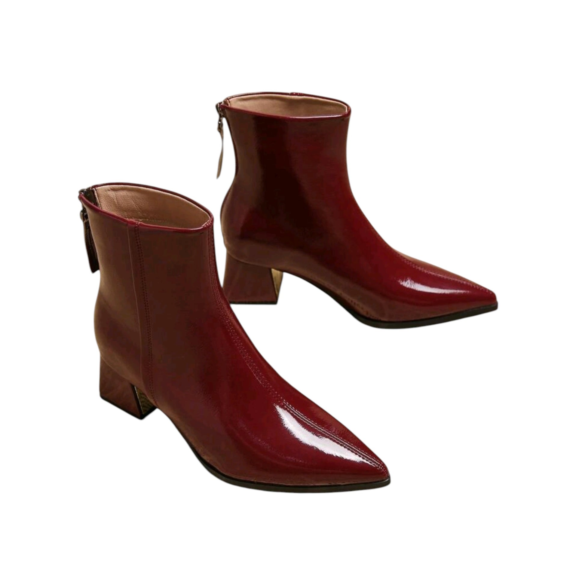 Címke nélküli, bordó, műbőr/bőr hatású, lakkhatású, hegyes orrú, vastag sarkú, cipzáros. Belső talp hossz: 24cm