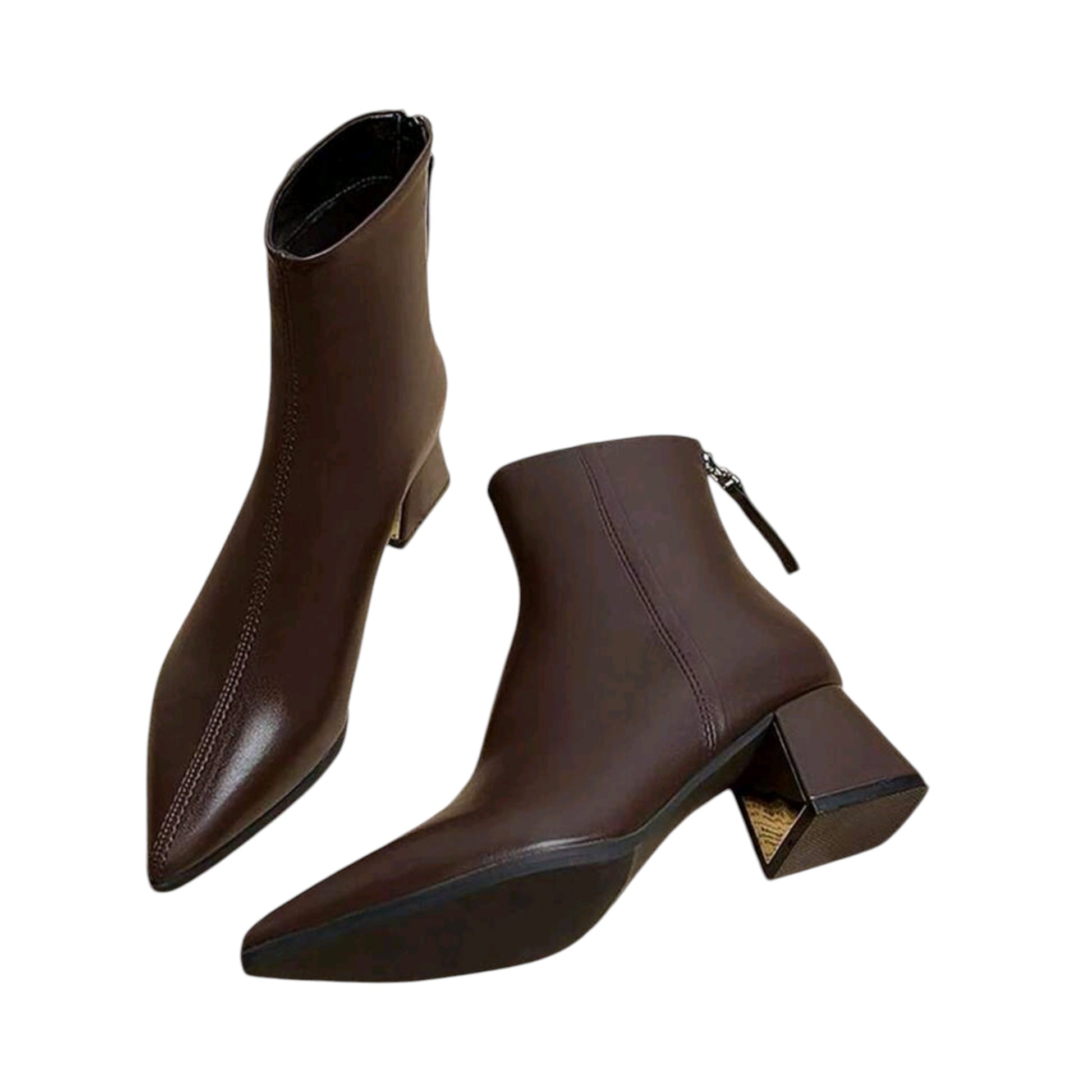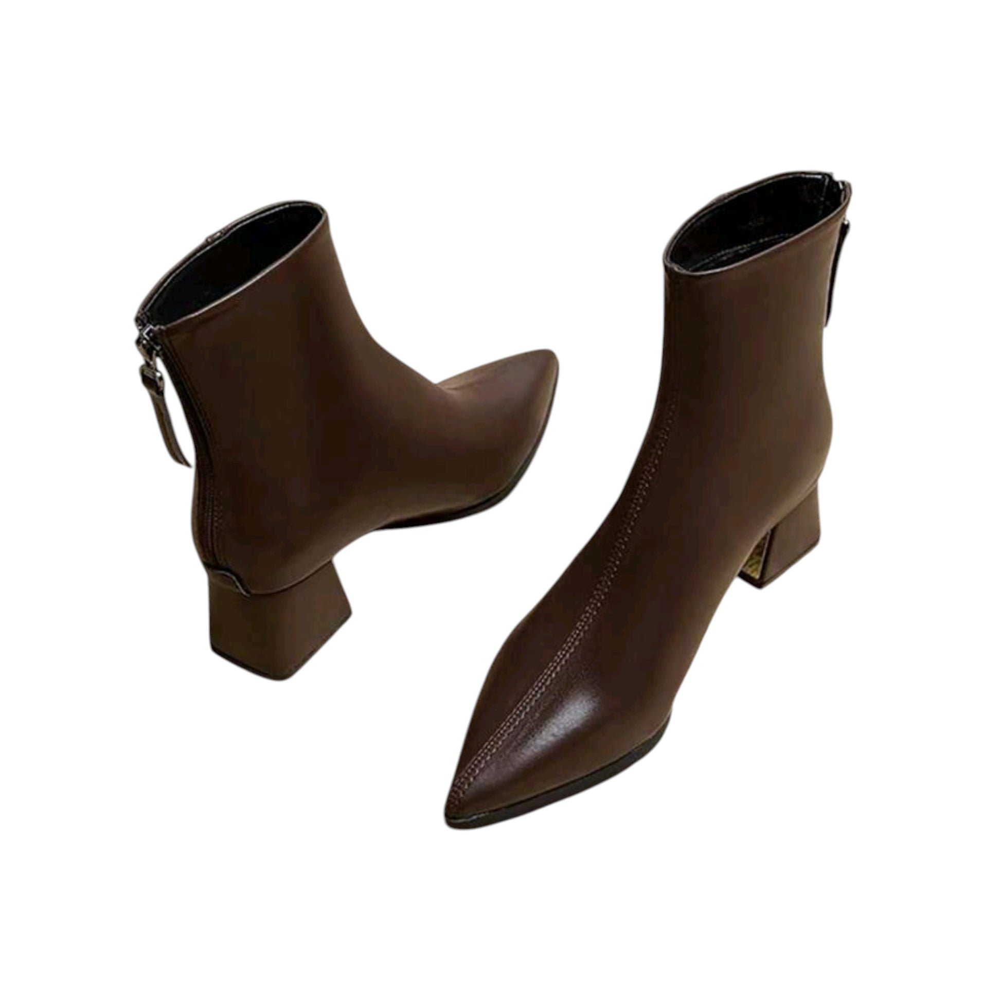 Címke nélküli, barna, műbőr/bőr hatású, hegyes orrú, vastag sarkú, cipzáros. Belső talp hossz: 25cm