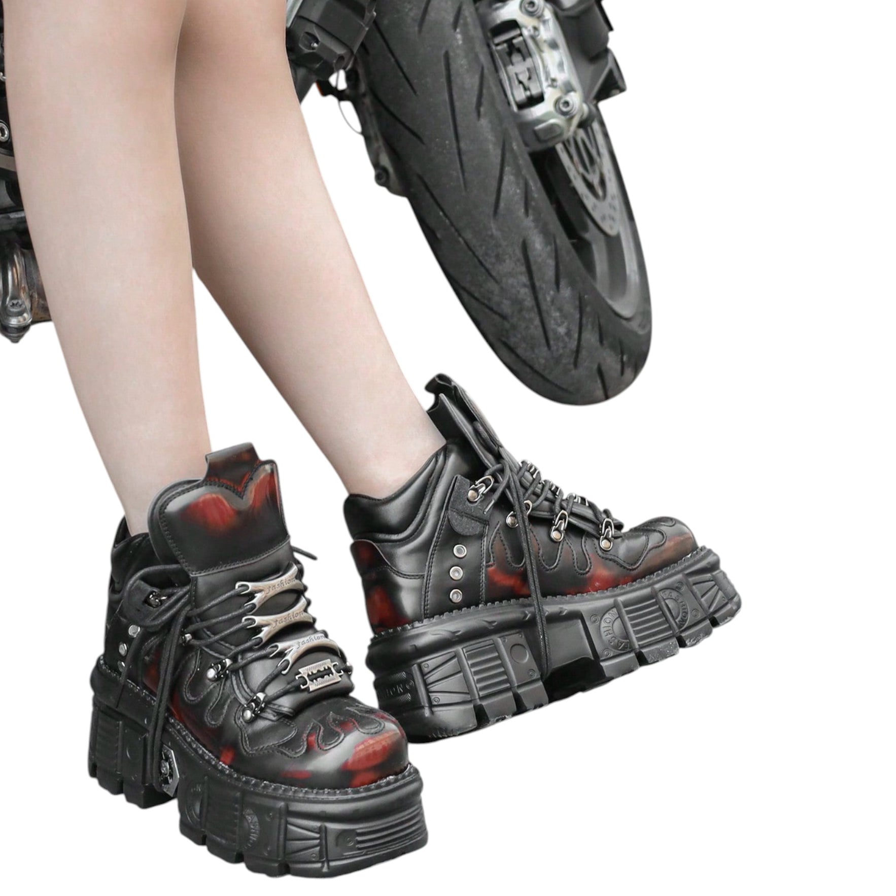 Címke nélküli, fekete és piros, láng mintás, fűzős, vastag platform talpú bakancs, fémes díszítésekkel.