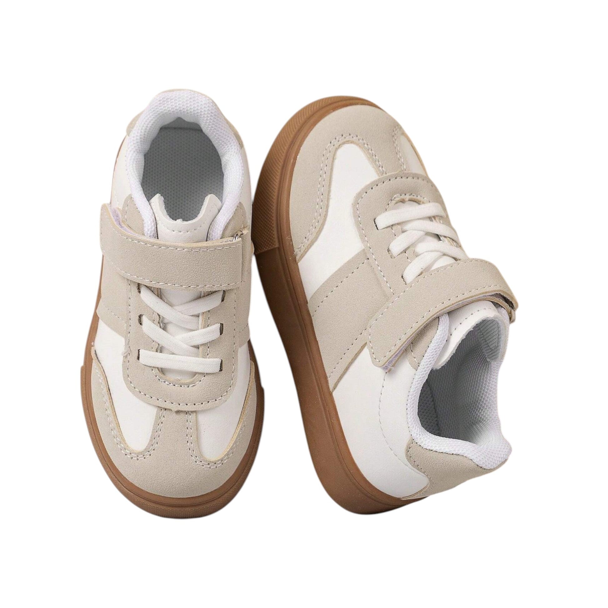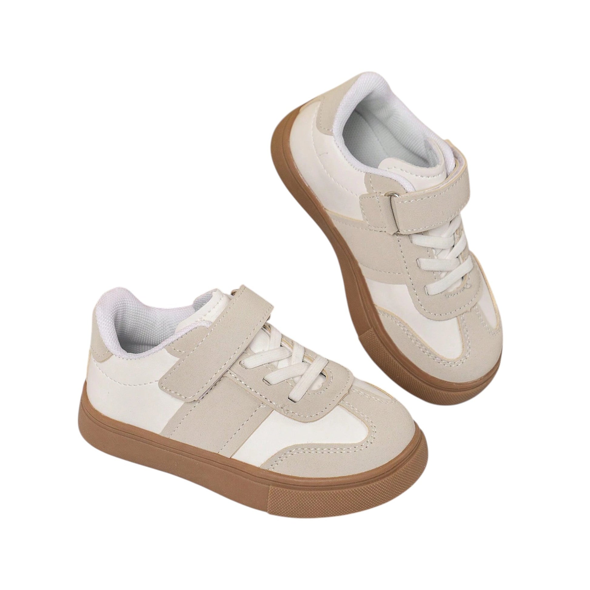 Címke nélküli, bézs és fehér, tépőzáras, alacsony szárú gyerek cipő. Belső talp hossz: 16cm