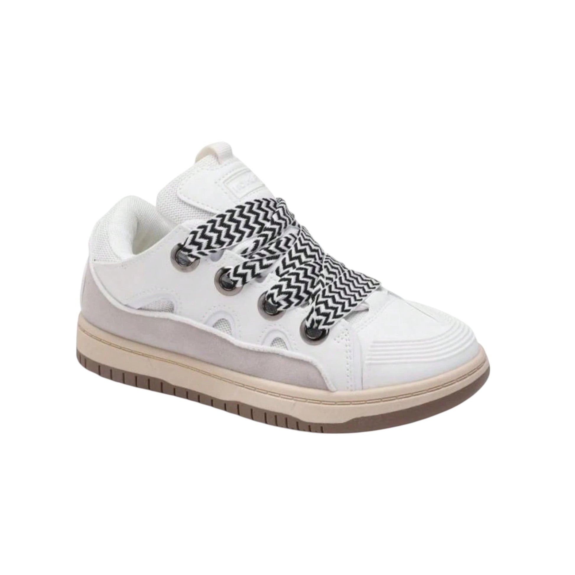 Címke nélküli, fehér és bézs, széles, fekete-fehér mintás fűző, kerek orr, vastag talp.