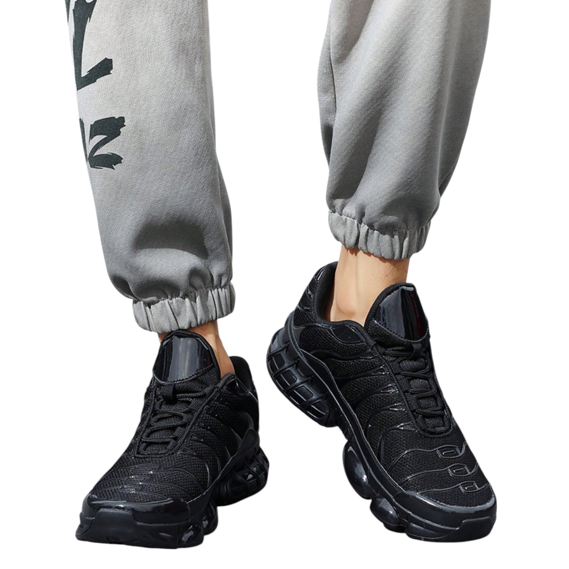 Címke nélküli, fekete, hálós és műbőr anyag kombinációja, vastag, barázdált talp.