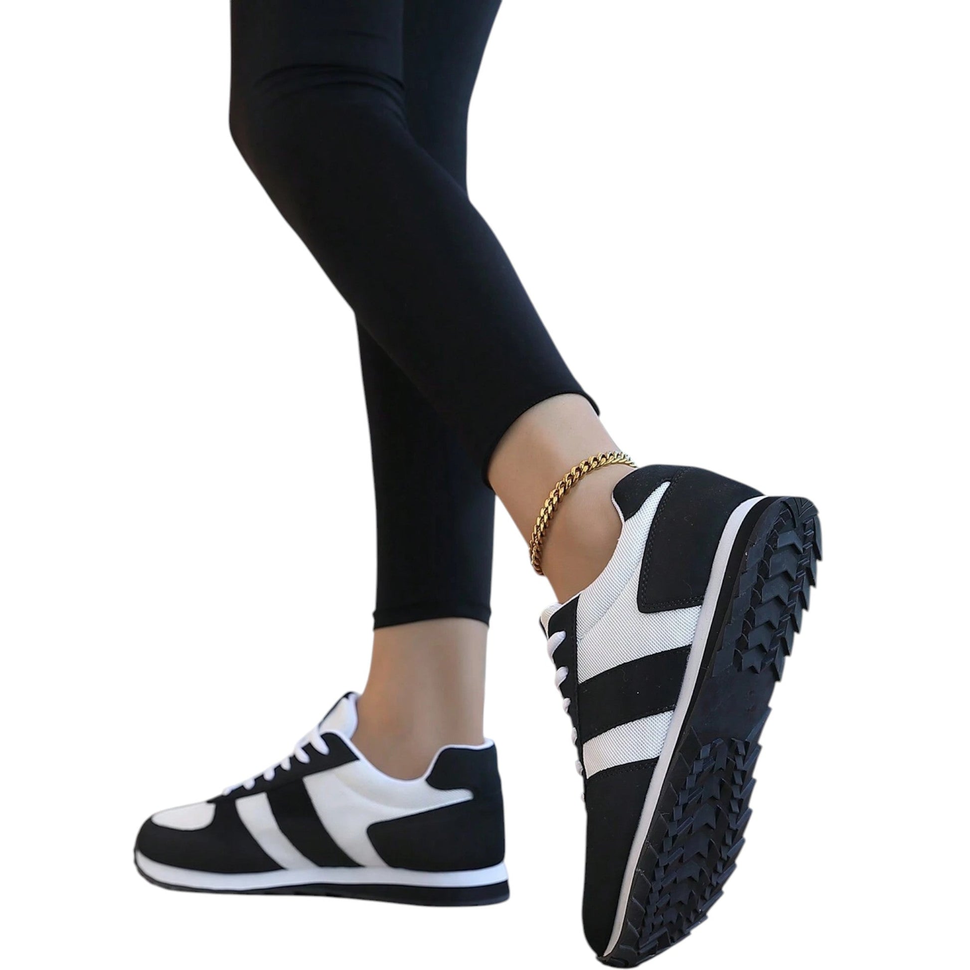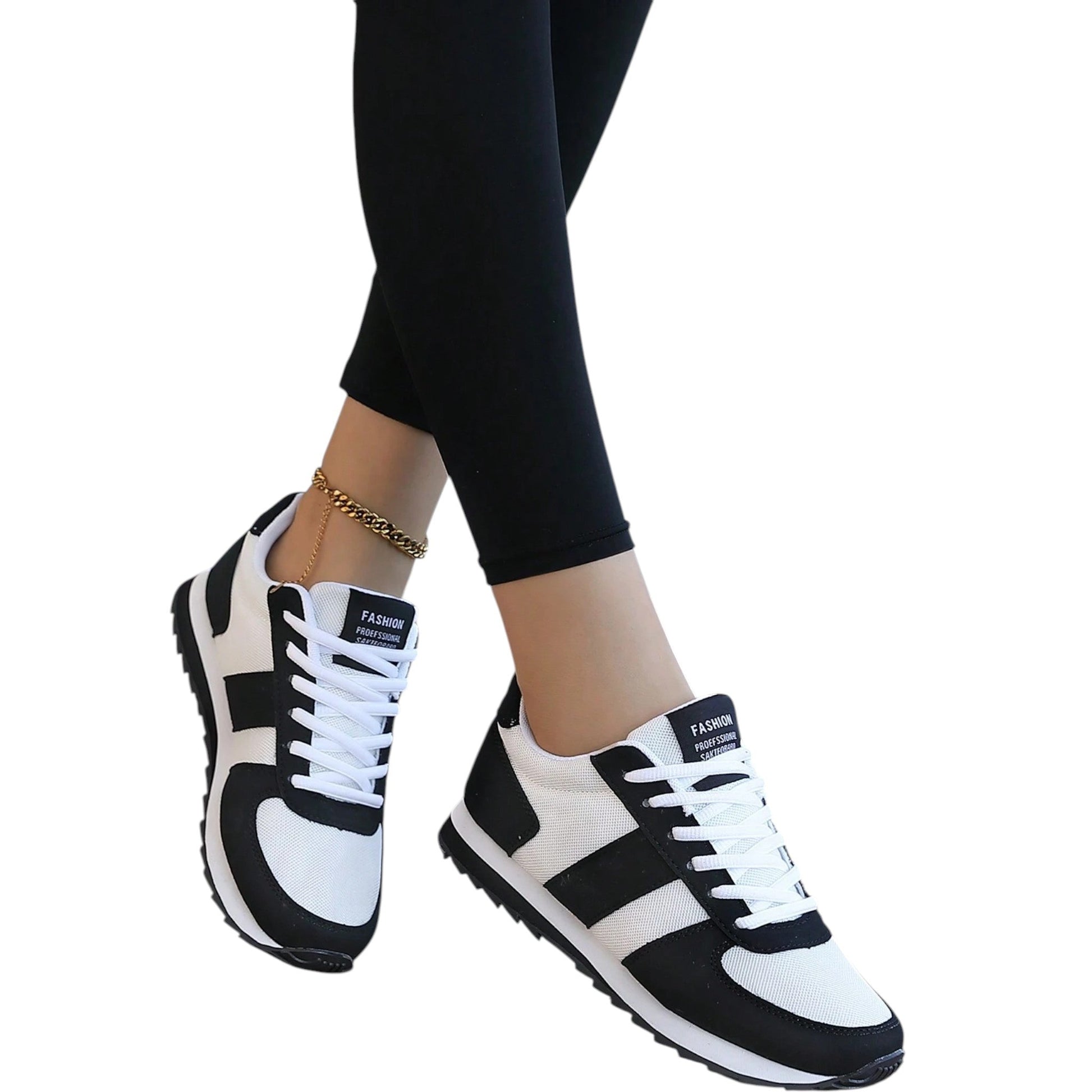 Címke nélküli, fekete és fehér, csíkos, hálós anyagú, fűzős sportcipő.