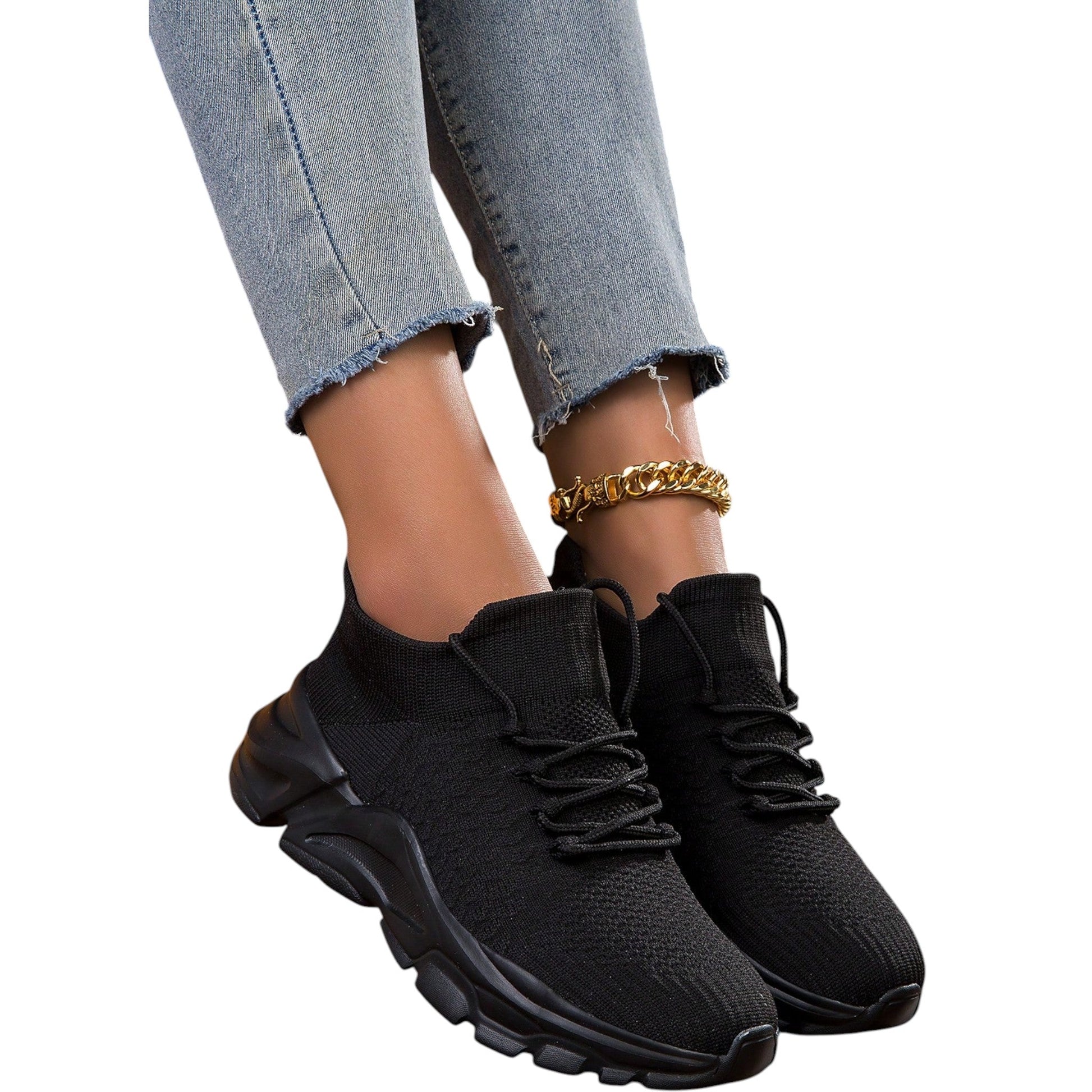 Címke nélküli, fekete, vastag barázdált talpú, fűzős sportcipő, kötött anyagú felsőrésszel.