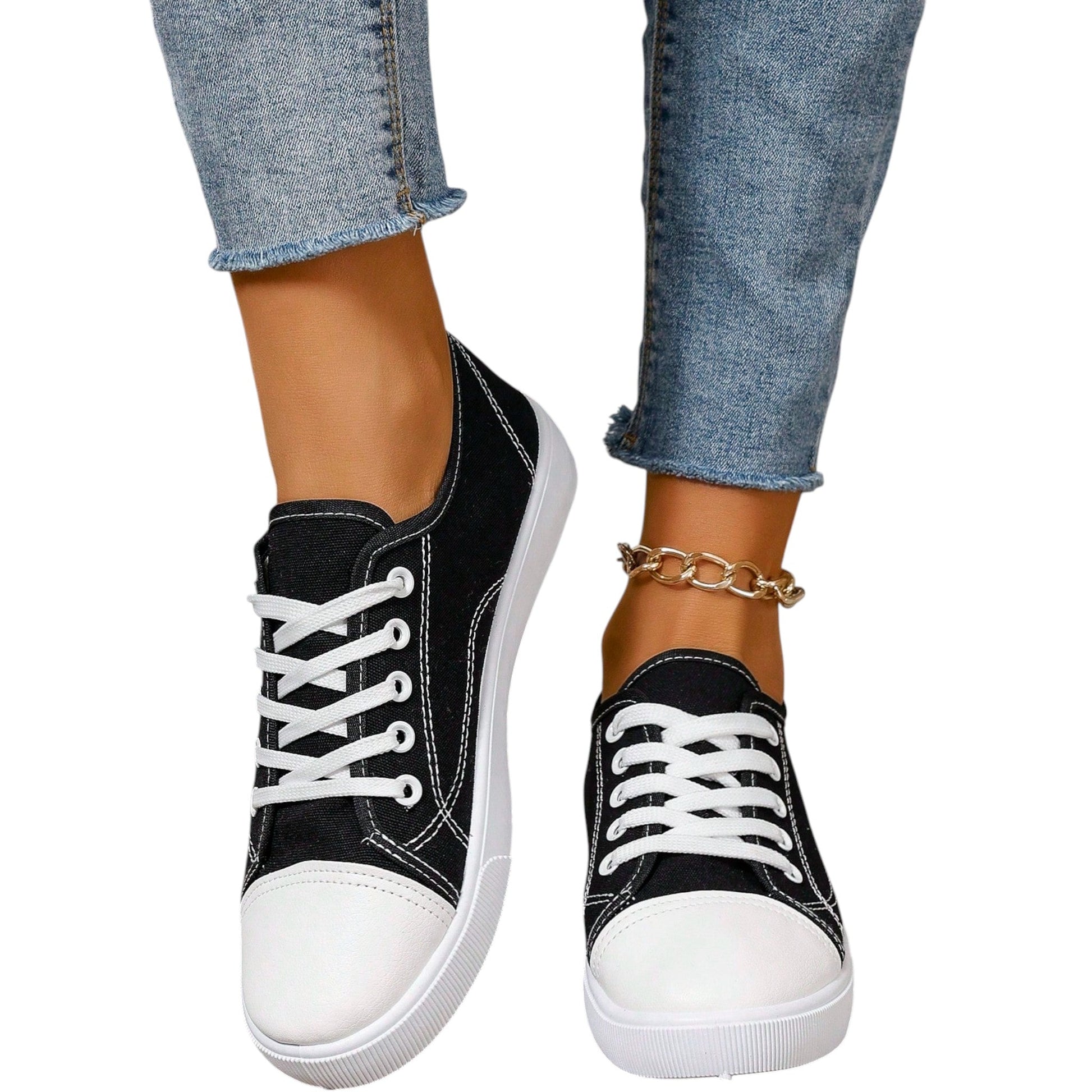 Címke nélküli, fekete vászon anyagú, fűzős sportcipő, fehér orr-résszel és talppal, alacsony szárú.