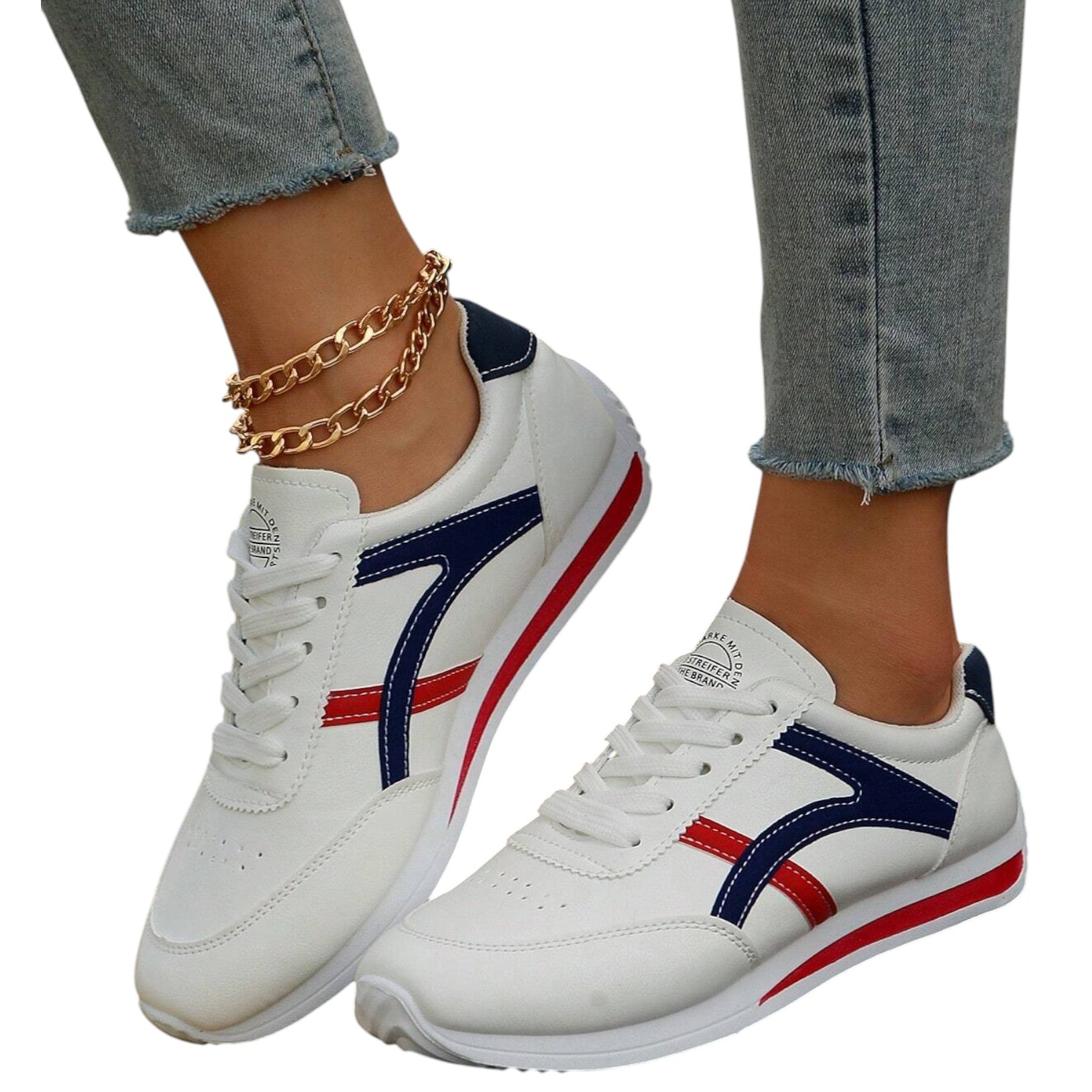 Címke nélküli, fehér, kék és piros csíkos sportcipő, fehér fűzővel. Belső talp hossz: 25cm