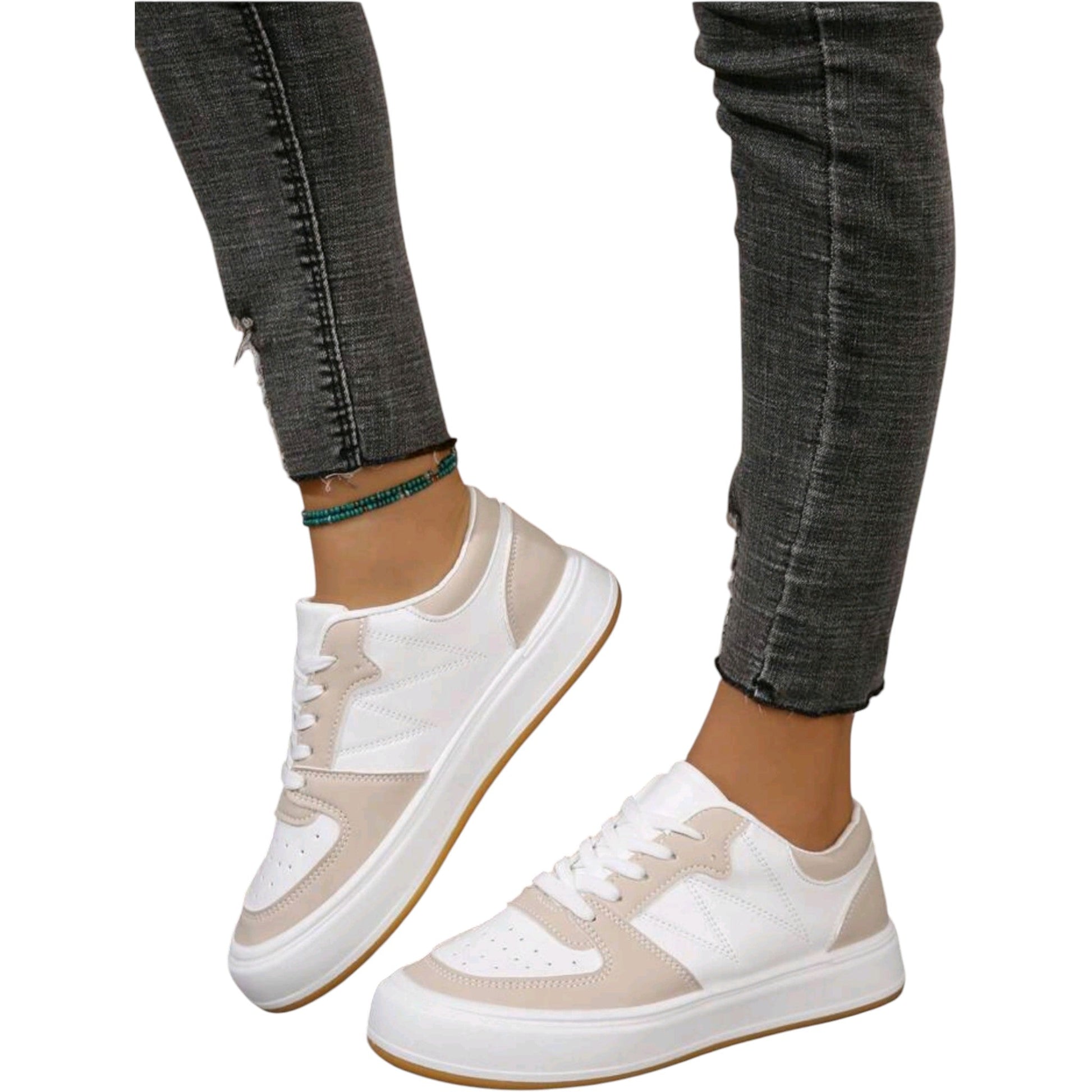 Címke nélküli, fehér/bézs, kétszínű, sportos cipő, fűzős záródású, vastag gumitalpú, lapos sarkú (kb. 2 cm).