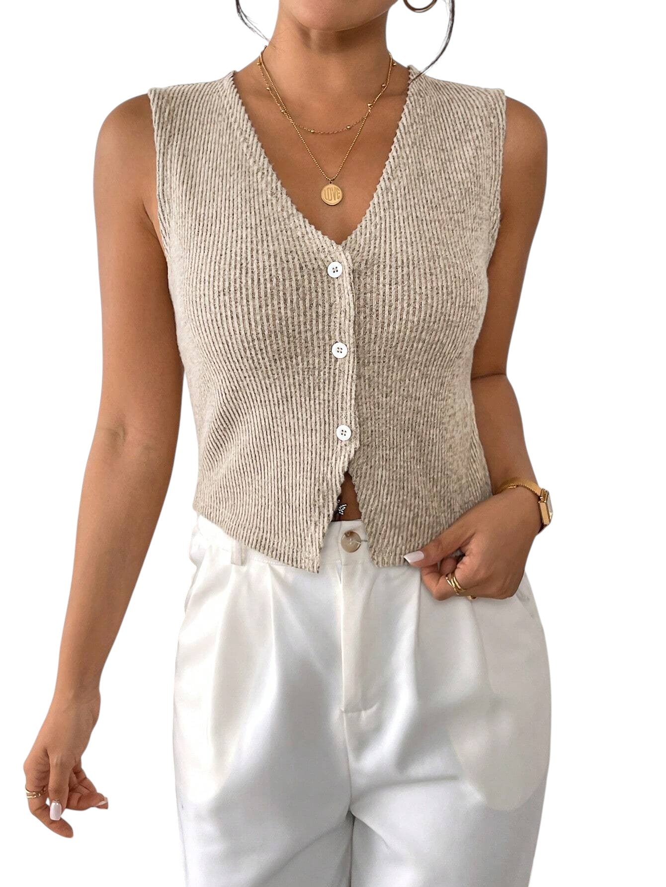 Címke nélküli, bézs, V-nyakú, ujjatlan, gombos kötött mellény