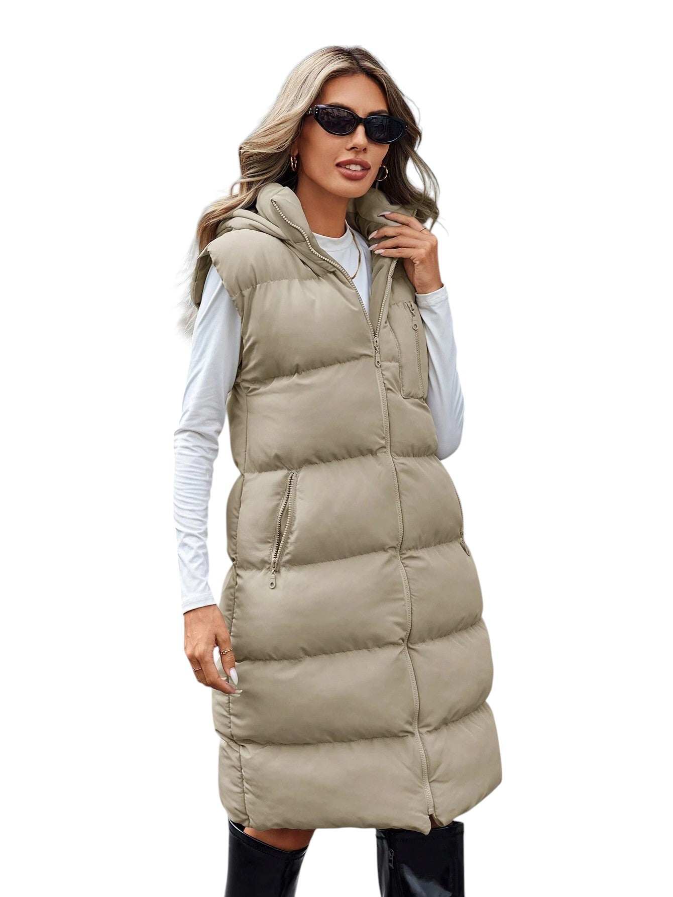 Címke nélküli, bézs, kapucnis, cipzáras és patentos záródású, hosszú steppelt mellény