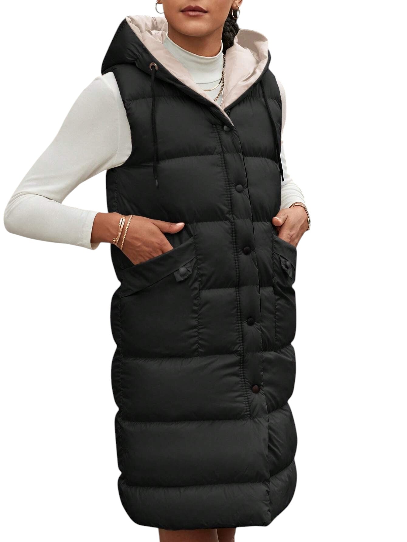 Címke nélküli, fekete, kapucnis, gombos záródású, hosszú steppelt mellény