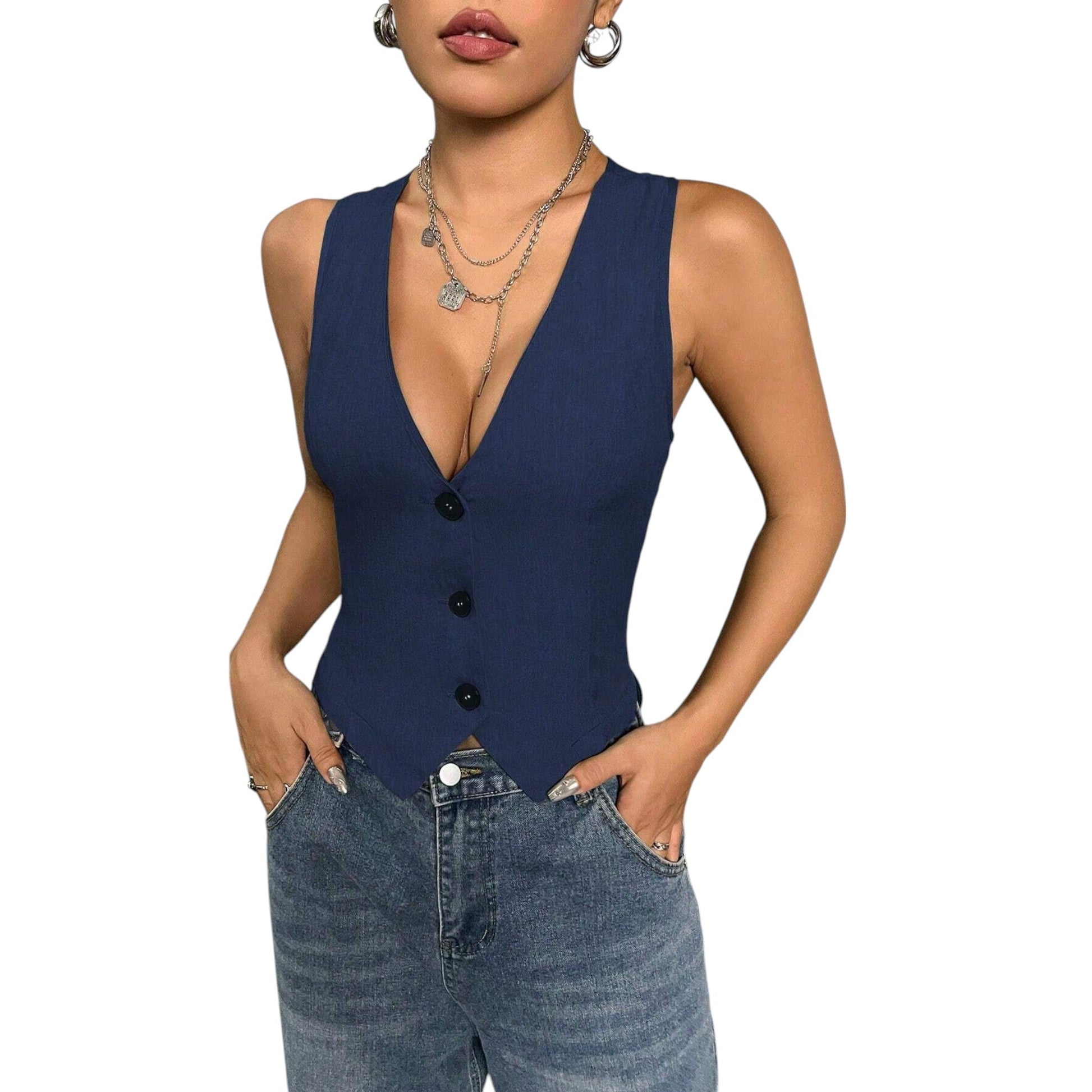 Címke nélküli, sötétkék, V-nyakú, ujjatlan, gombos mellény.