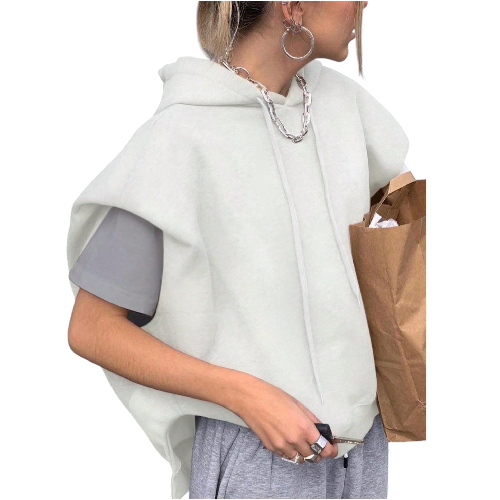 Címke nélküli, fehér, ujjatlan, kapucnis pulóver.
