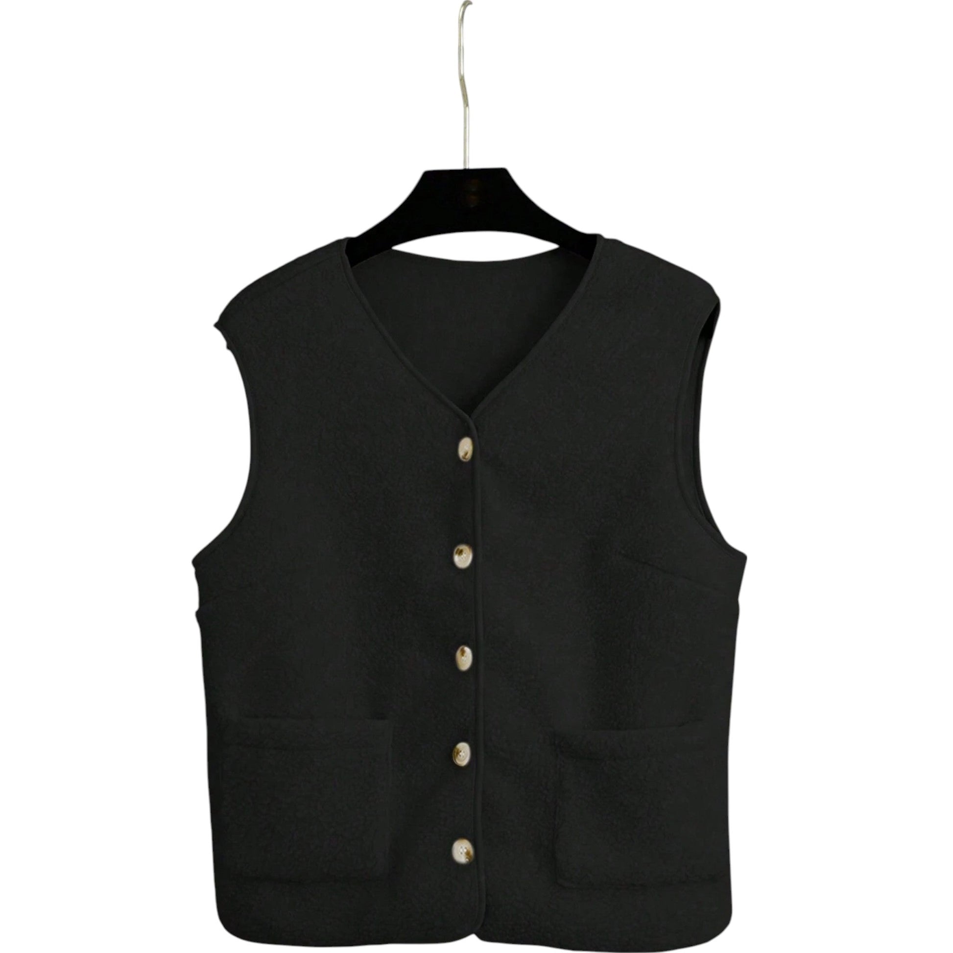 Címke nélküli, fekete, V-nyakú, ujjatlan, gombos, zsebes mellény.