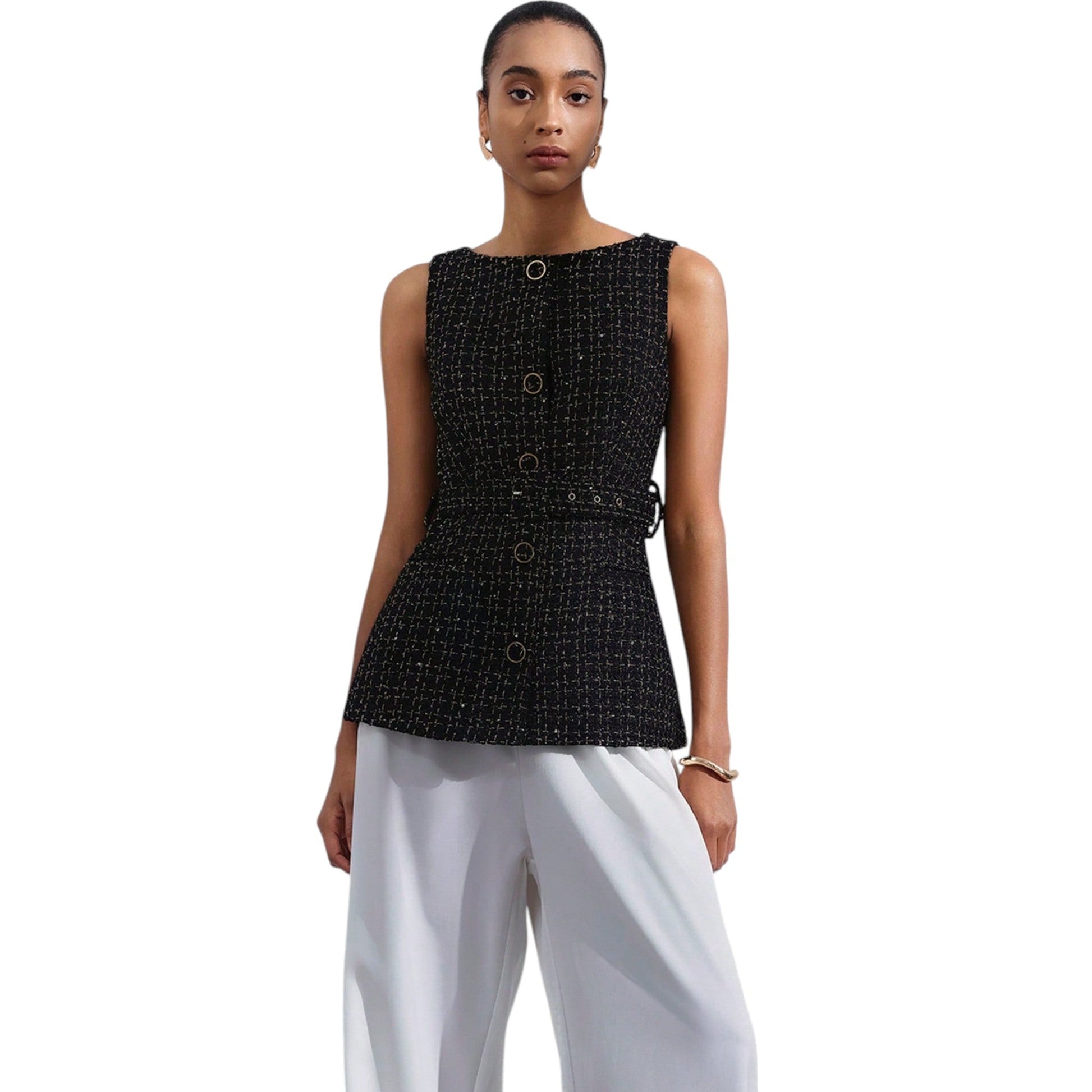 Címke nélküli, fekete, ujjatlan felső tweed anyagból, kerek nyakkivágással, peplum fazonnal és elől gombokkal.