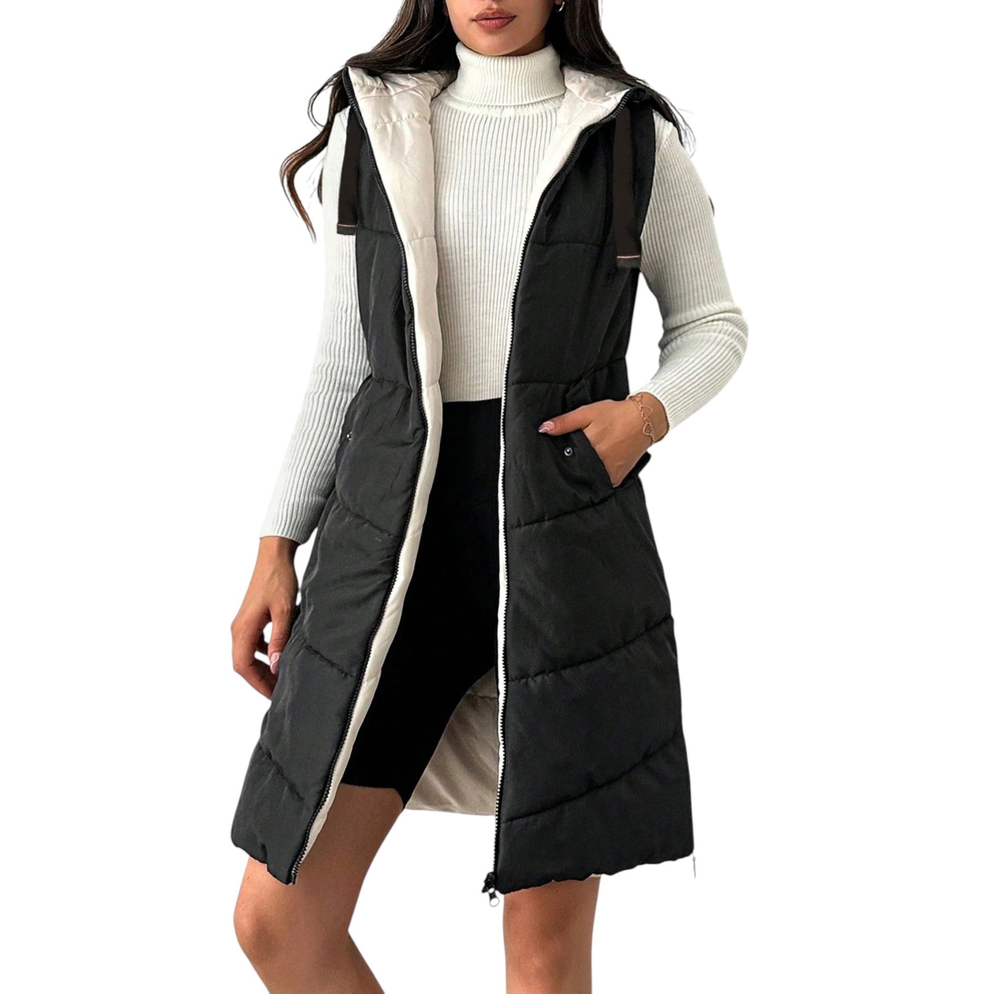 Címke nélküli, fekete és bézs színű, steppelt mellény. Hosszú fazonú, kapucnis, cipzáras záródású. Elöl két zsebbel, bézs színű béléssel.