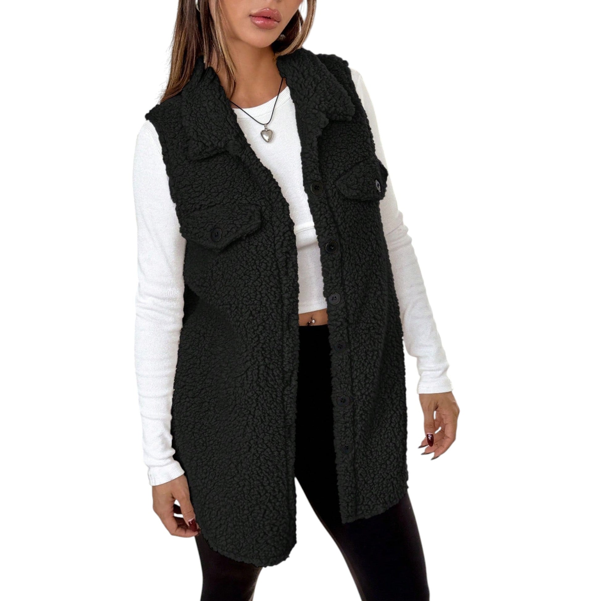 Címke nélküli, fekete, sherpa anyagú mellény, gombokkal és zsebekkel.