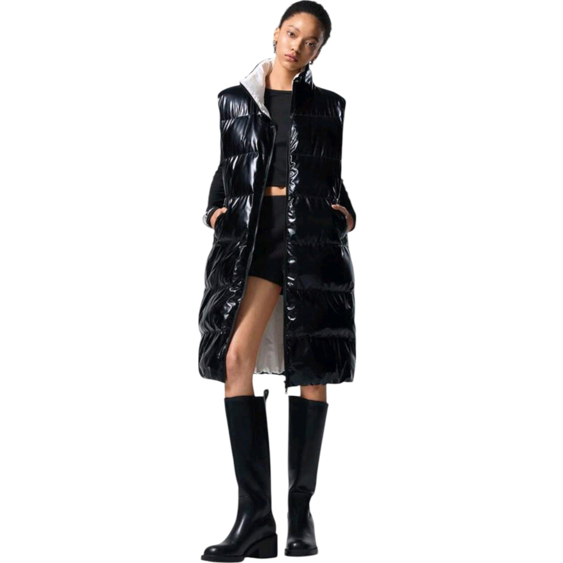 Címke nélküli, fekete, fényes, hosszú, steppelt, magas nyakú mellény.