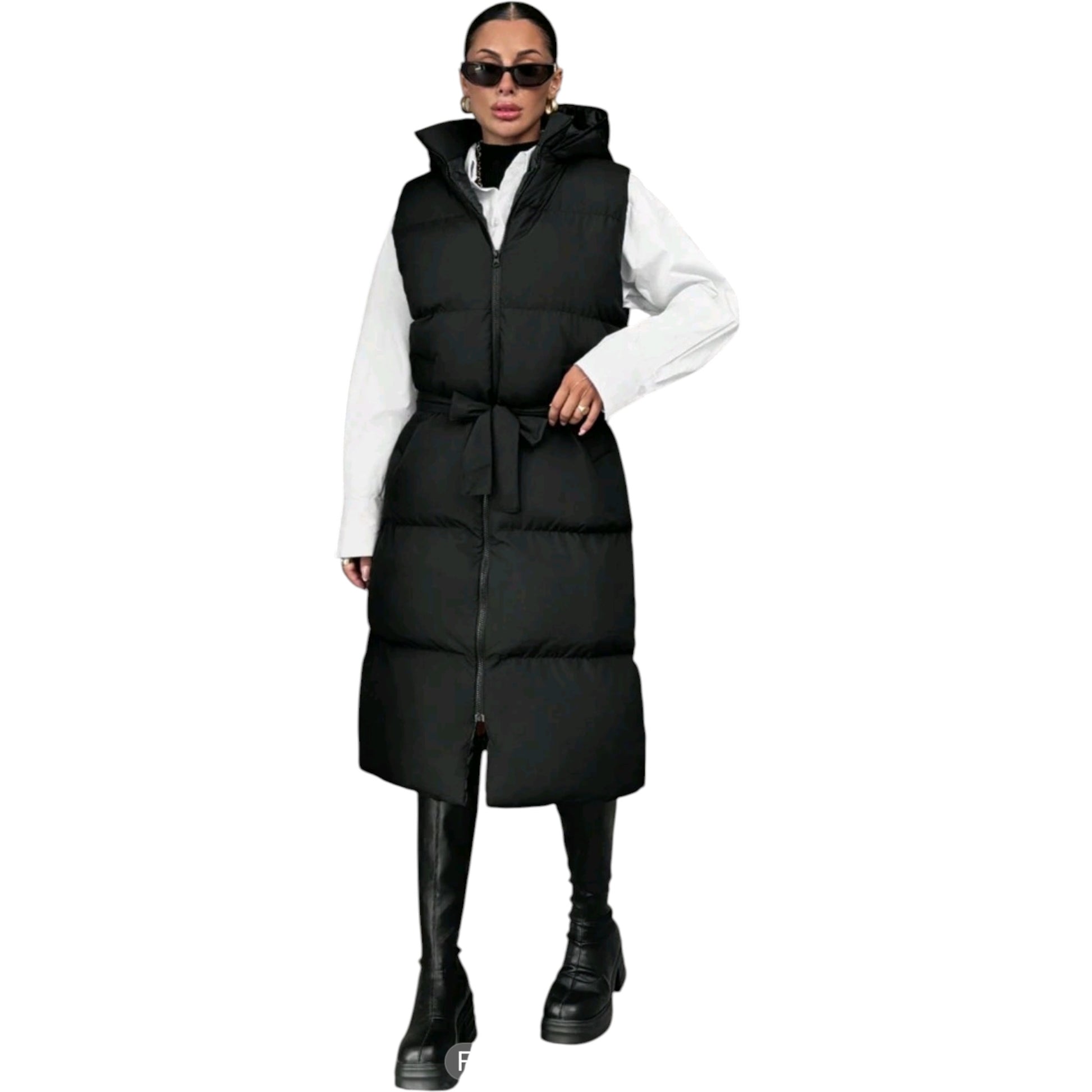 Címke nélküli, fekete, hosszú, kapucnis steppelt mellény, elöl cipzárral, levehető övvel, elöl kétoldali cipzáras zsebbel.