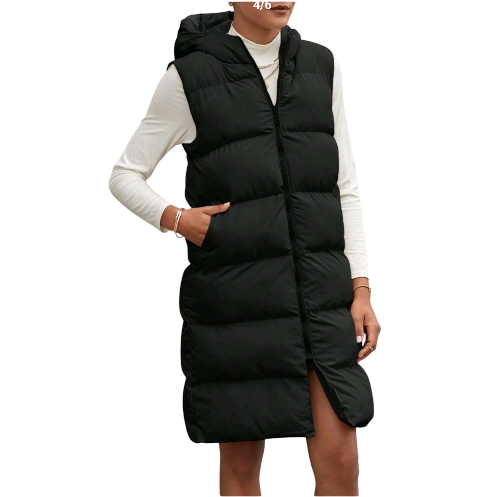 Címke nélküli, fekete, hosszú, kapucnis steppelt mellény, elöl cipzárral.
