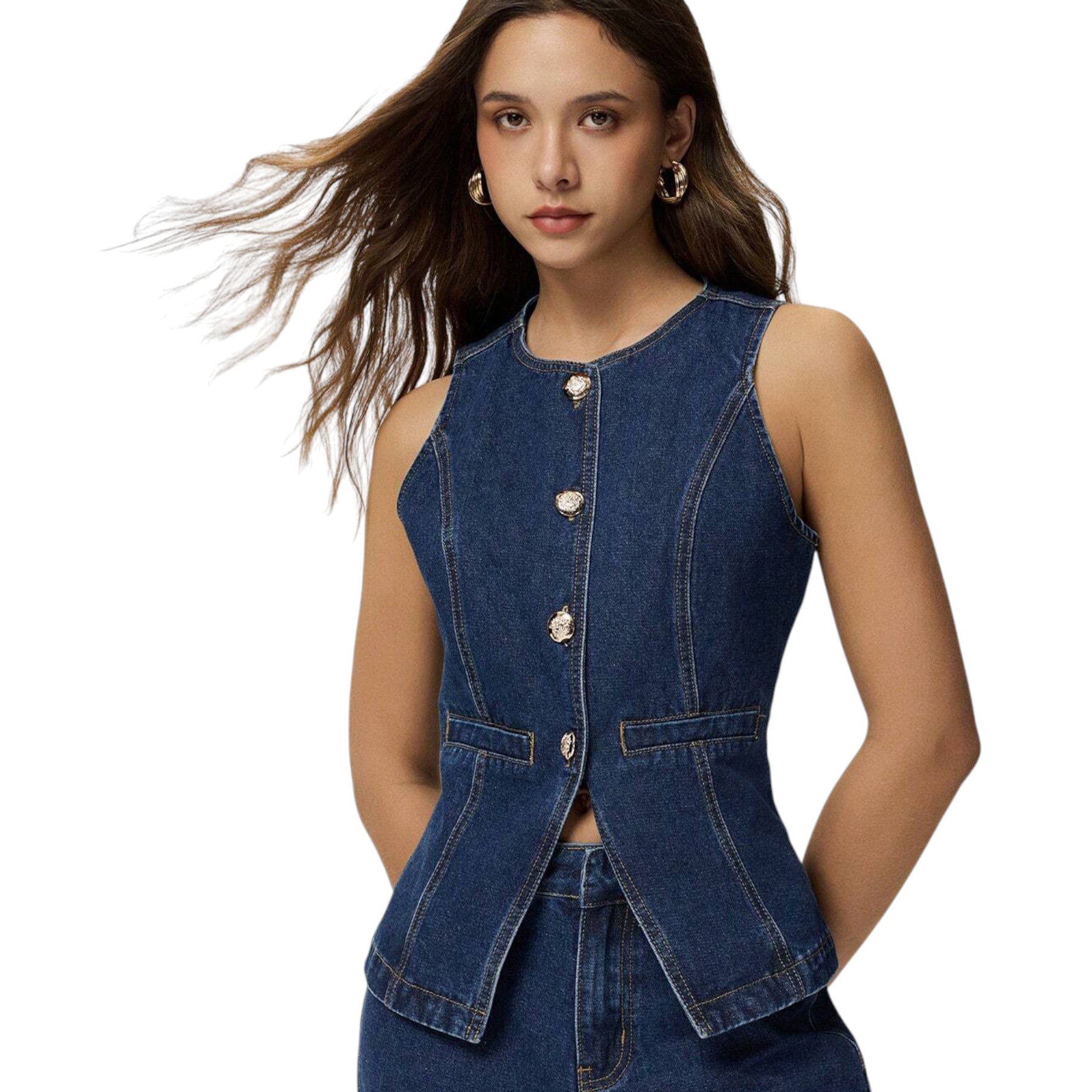 Címke nélküli, kék, farmer mellény, V-alakban végződő aljjal, elől gombokkal és derékban rejtett zsebekkel.