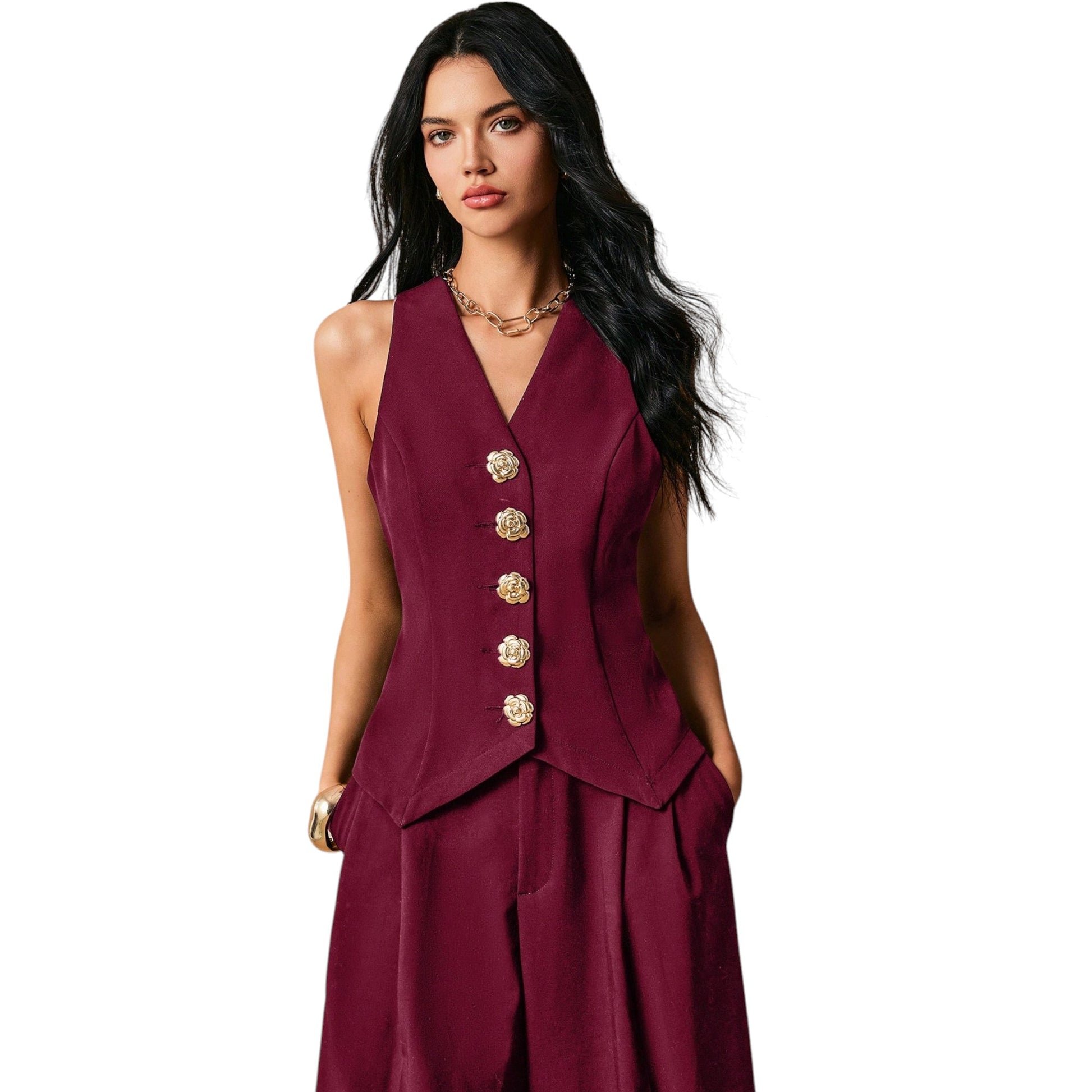 Címke nélküli, bordó, mély V-nyakú, ujjatlan, gombos mellény.