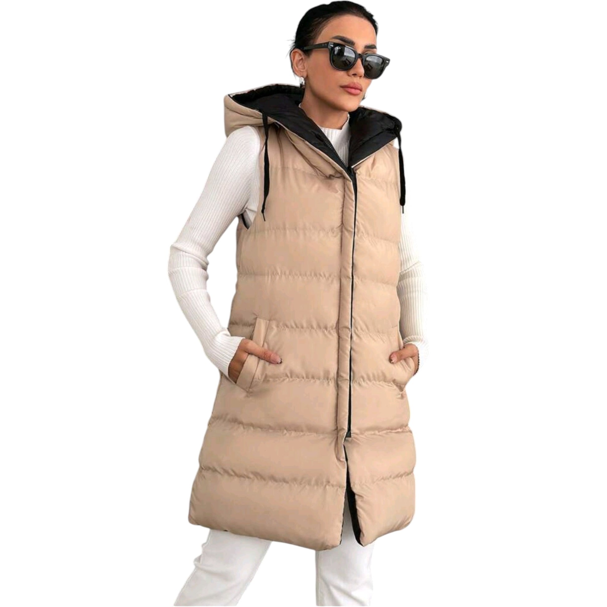 Címke nélküli, bézs, hosszú, kifordítható, kapucnis steppelt mellény, a másik oldala fekete.