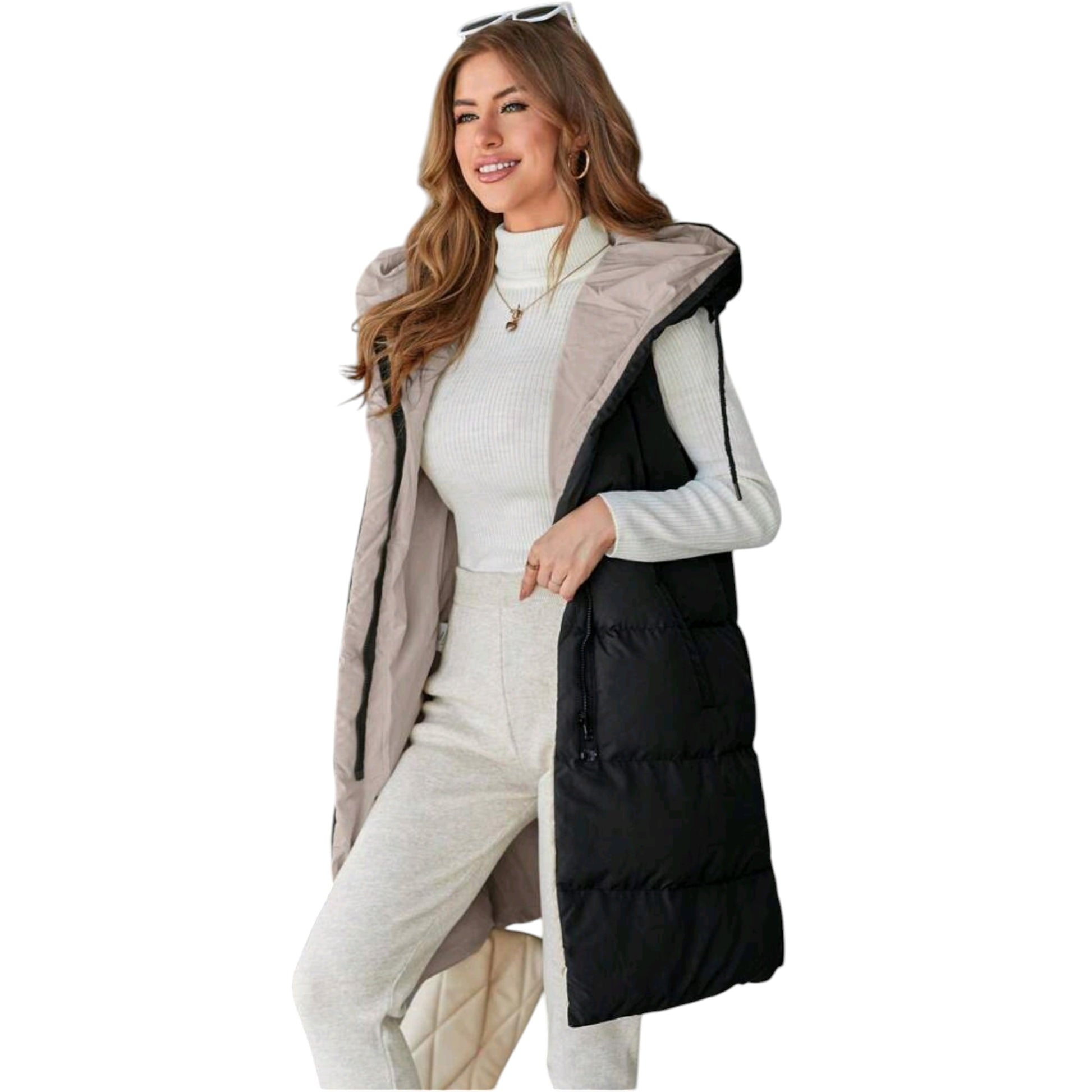 Címke nélküli, bézs, hosszú, kifordítható, kapucnis steppelt mellény, a másik oldala fekete.