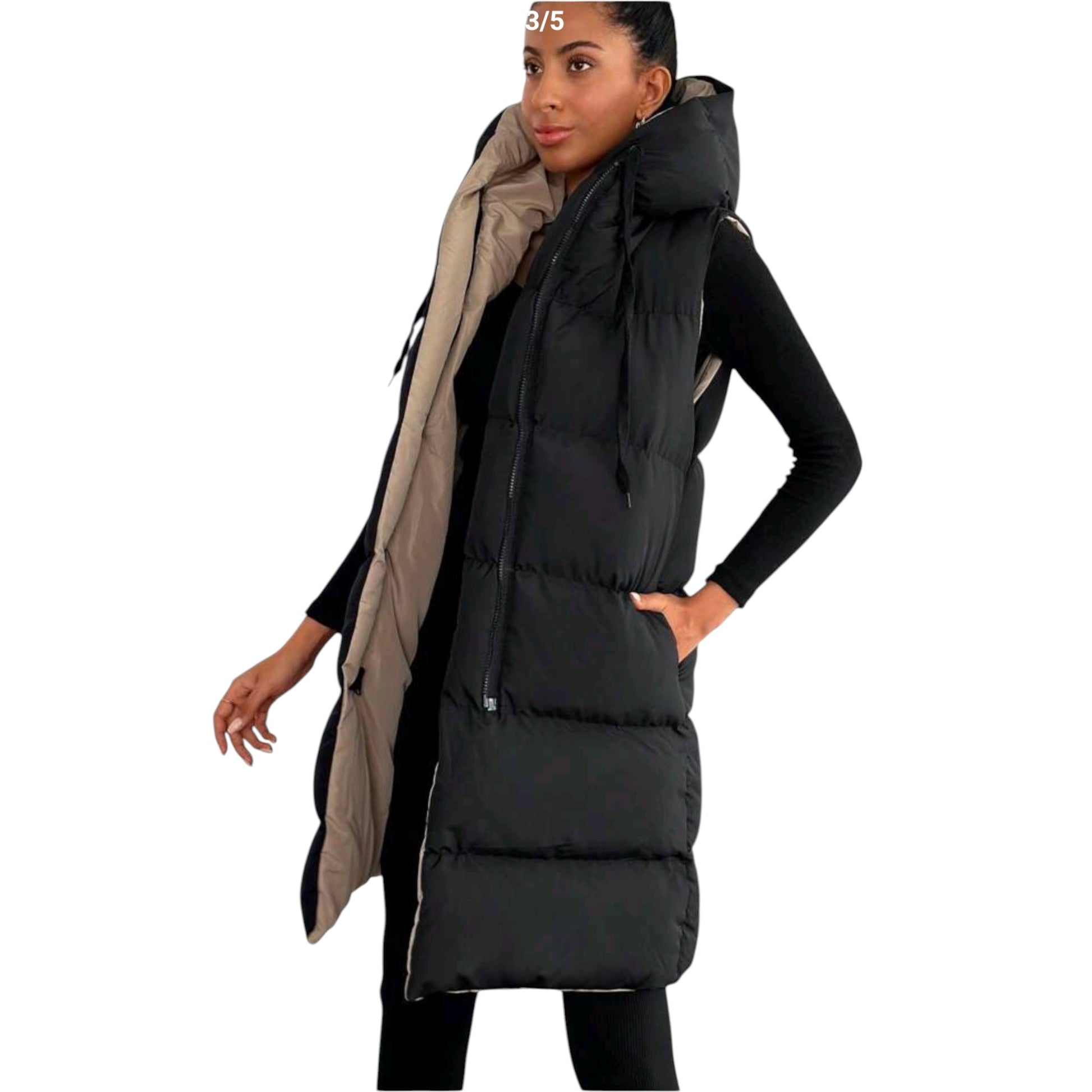Címke nélküli, fekete, hosszú, kifordítható, kapucnis steppelt mellény, a másik oldala bézs.