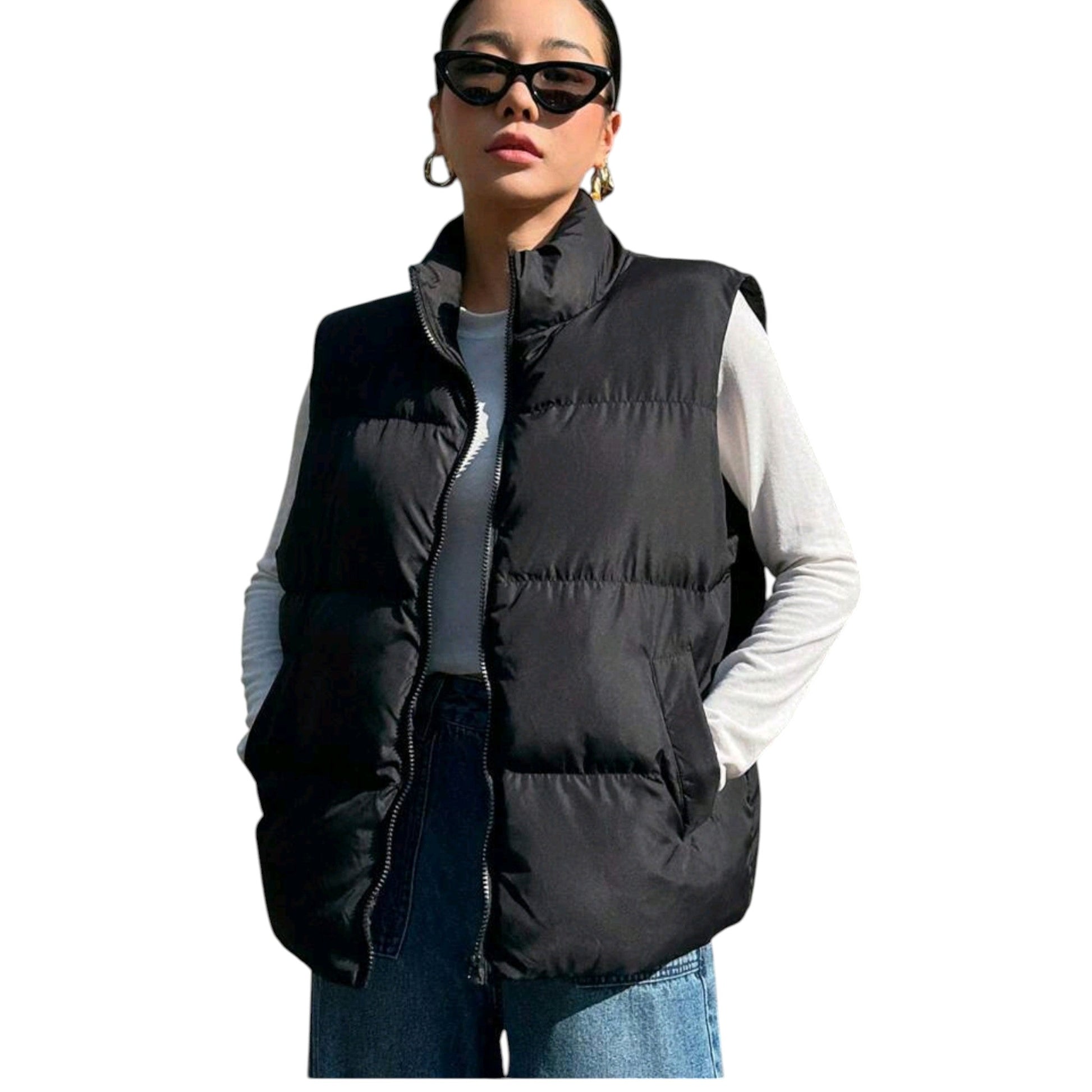 Címke nélküli, fekete, rövid, steppelt pufi mellény, magas gallérral, elöl cipzárral záródik.