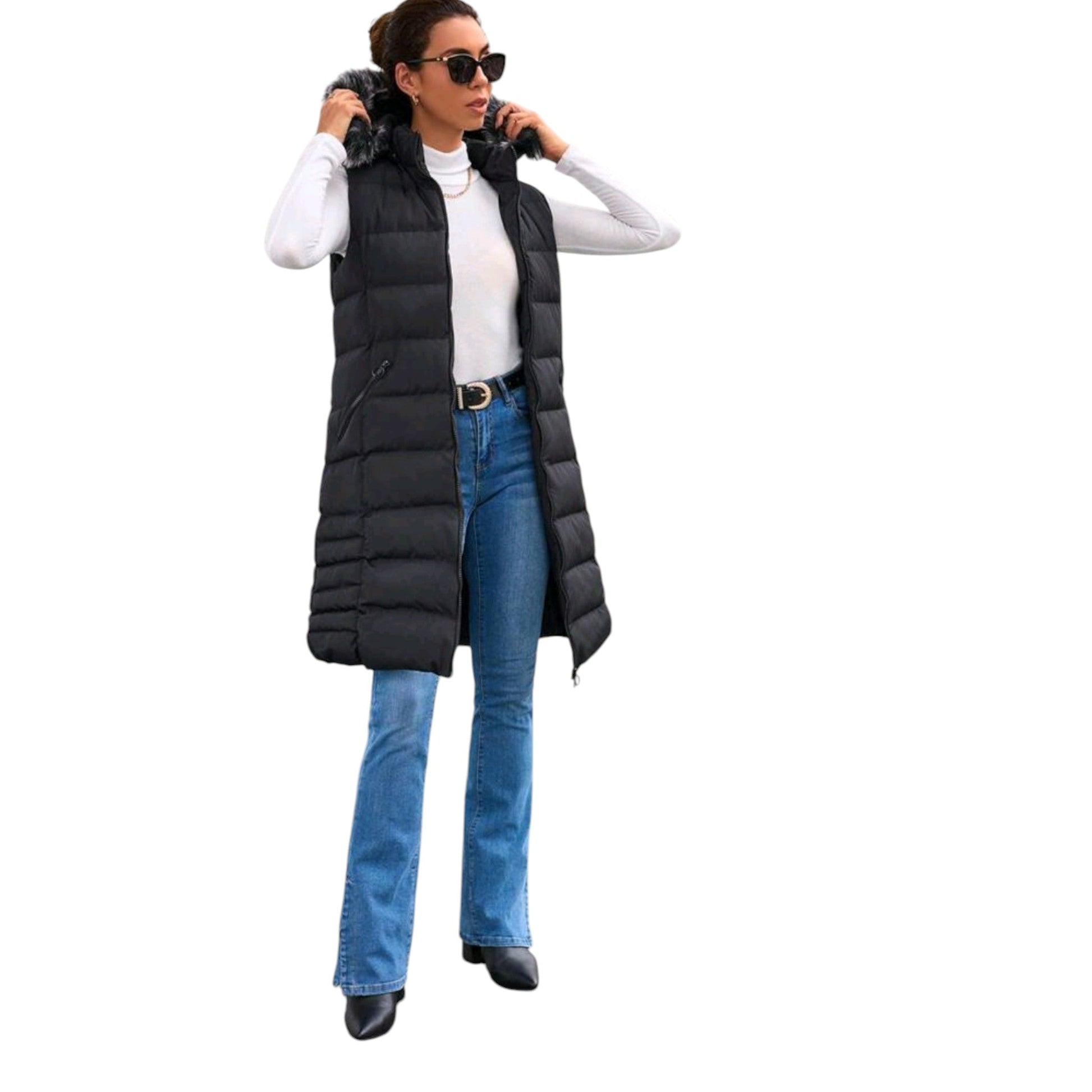 Címke nélküli, fekete, hosszú, steppelt mellény, levehető műszőrme kapucnival, elöl cipzárral záródik.
