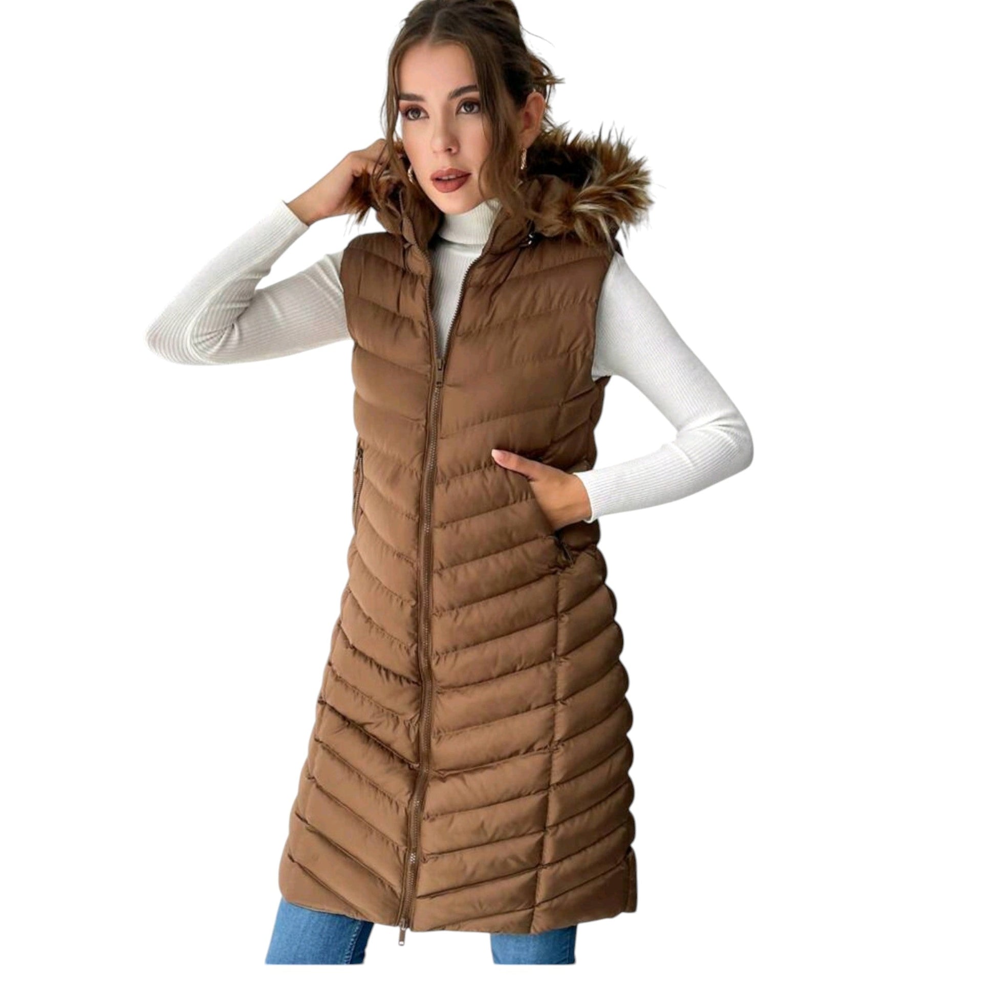 Címke nélküli, barna, hosszú, steppelt mellény, levehető műszőrme kapucnival, elöl cipzárral záródik.