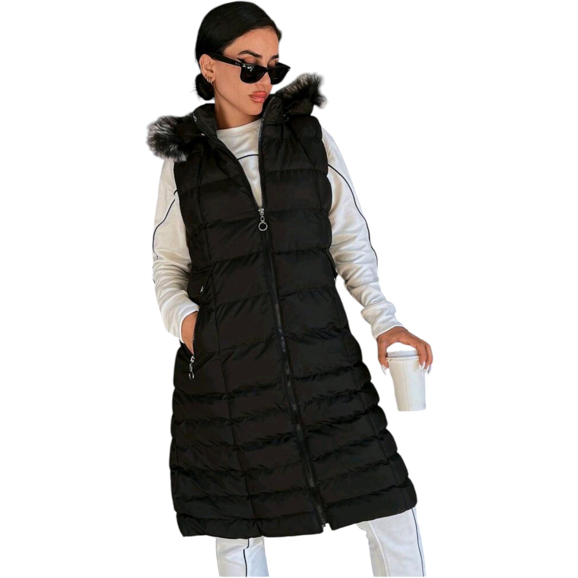 Címke nélküli, fekete, hosszú, steppelt mellény, levehető kapucnival és műszőrme szegéllyel, elől végig cipzárral.