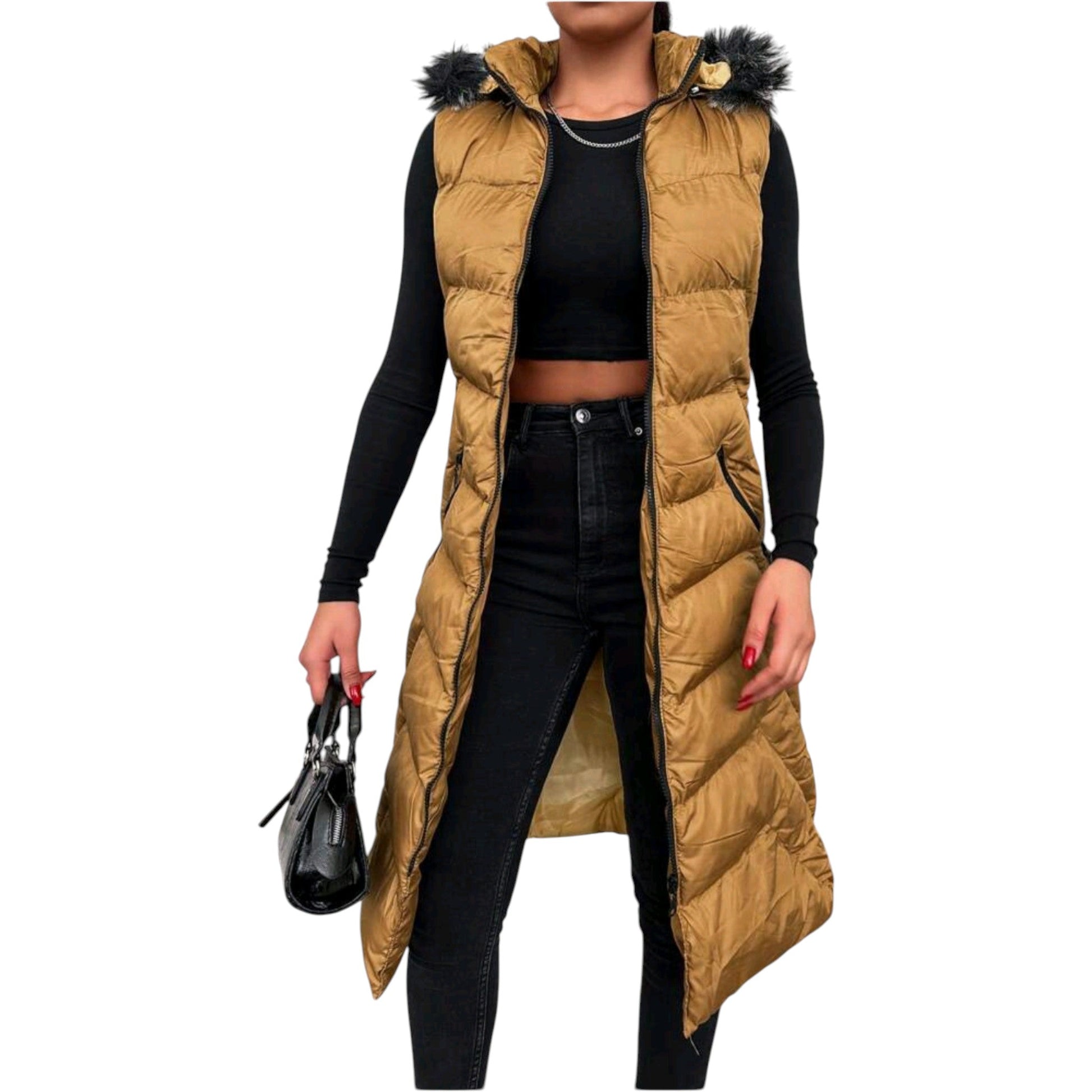 Címke nélküli, barna, hosszú, átlósan steppelt mellény, levehető kapucnival és műszőrme szegéllyel, elől végig cipzárral.