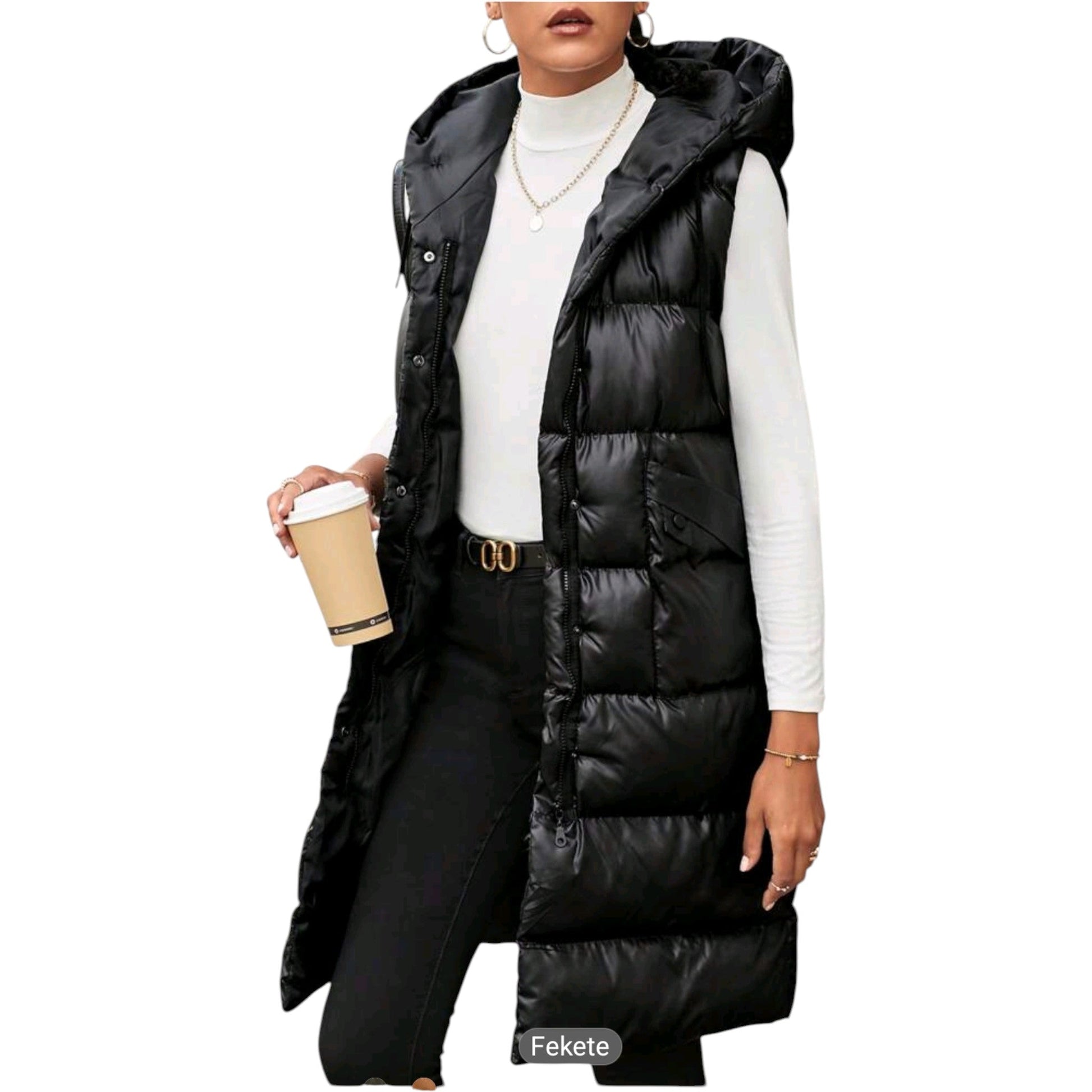 Címke nélküli, fekete, hosszú, fényes felületű, vastagon steppelt mellény, fix kapucnival, elől cipzárral és patentos fedőpánttal.