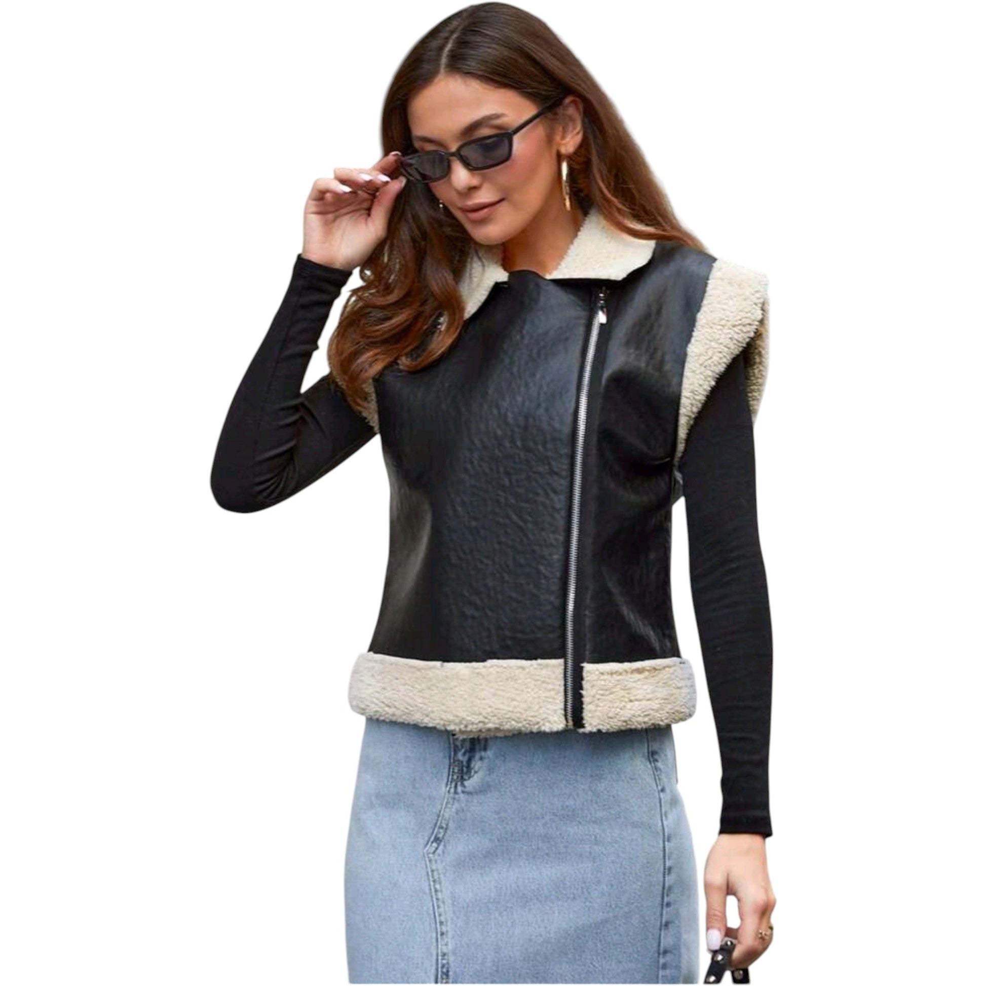 Címke nélküli, fekete, bézs műszőrmével bélelt, műbőr hatású, ujjatlan mellény, galléros, aszimmetrikus elülső cipzárral.