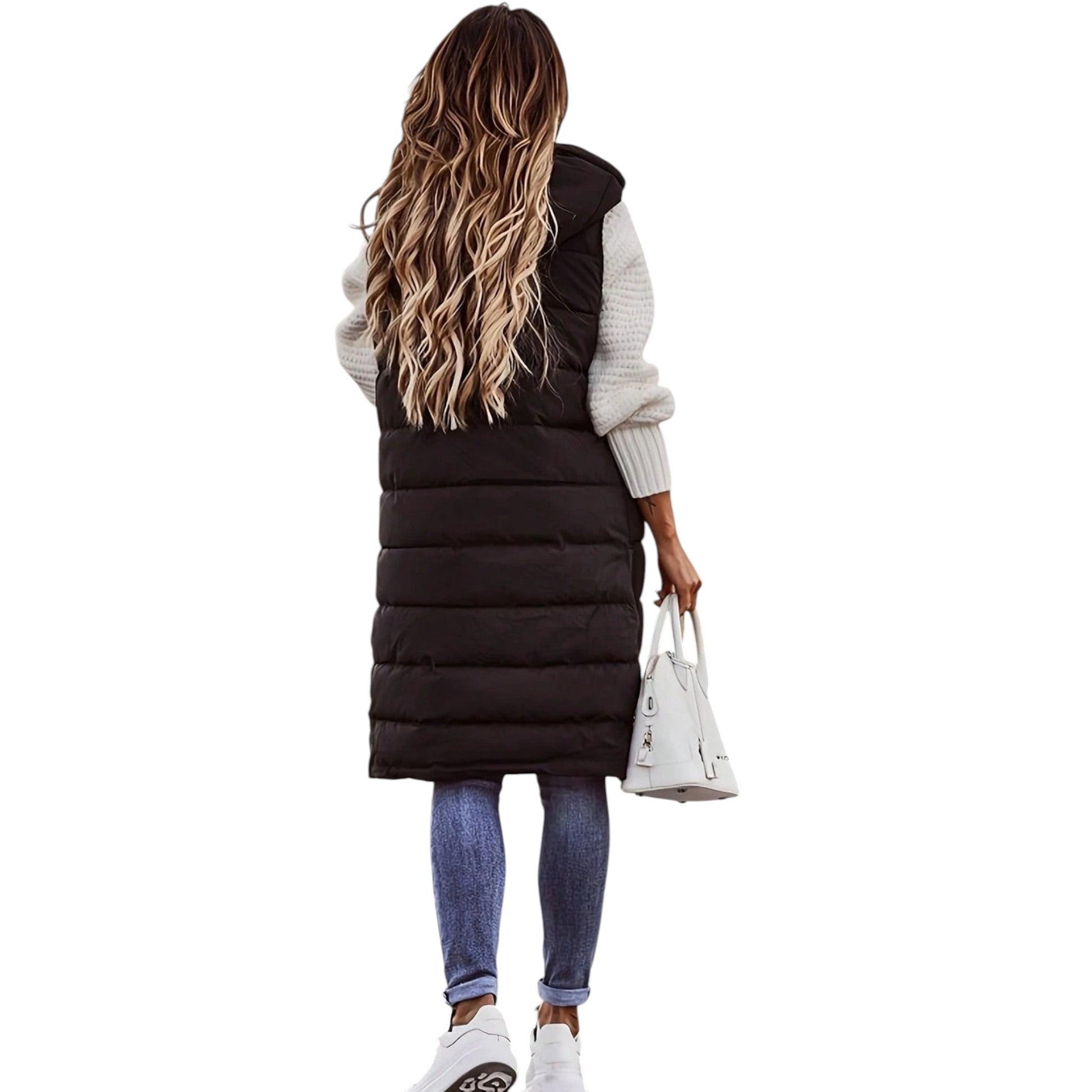 Címke nélküli, fekete, hosszú, steppelt, kapucnis mellény.