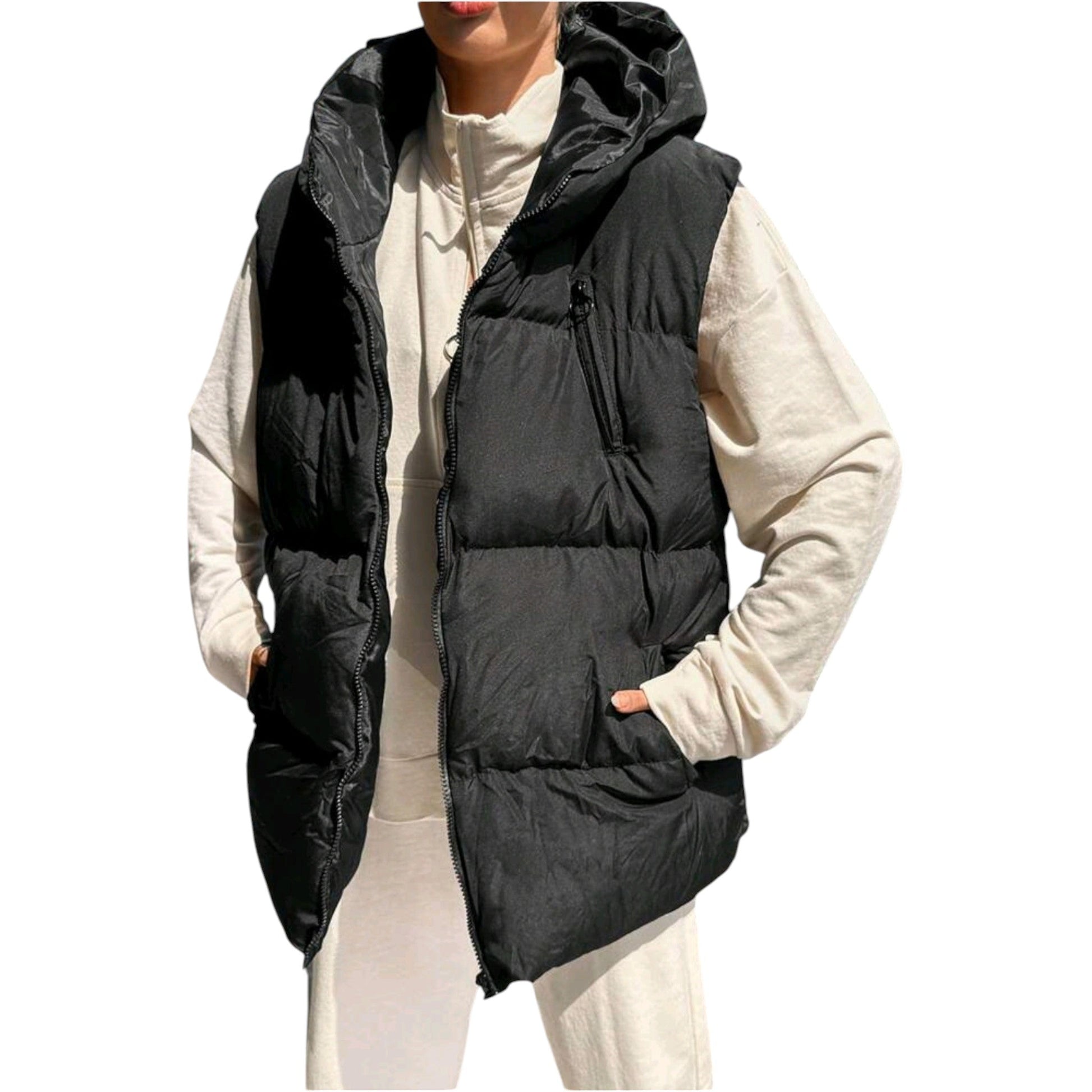 Címke nélküli, fekete, rövid steppelt mellény, kapucnival, elöl cipzárral, álló gallérral.