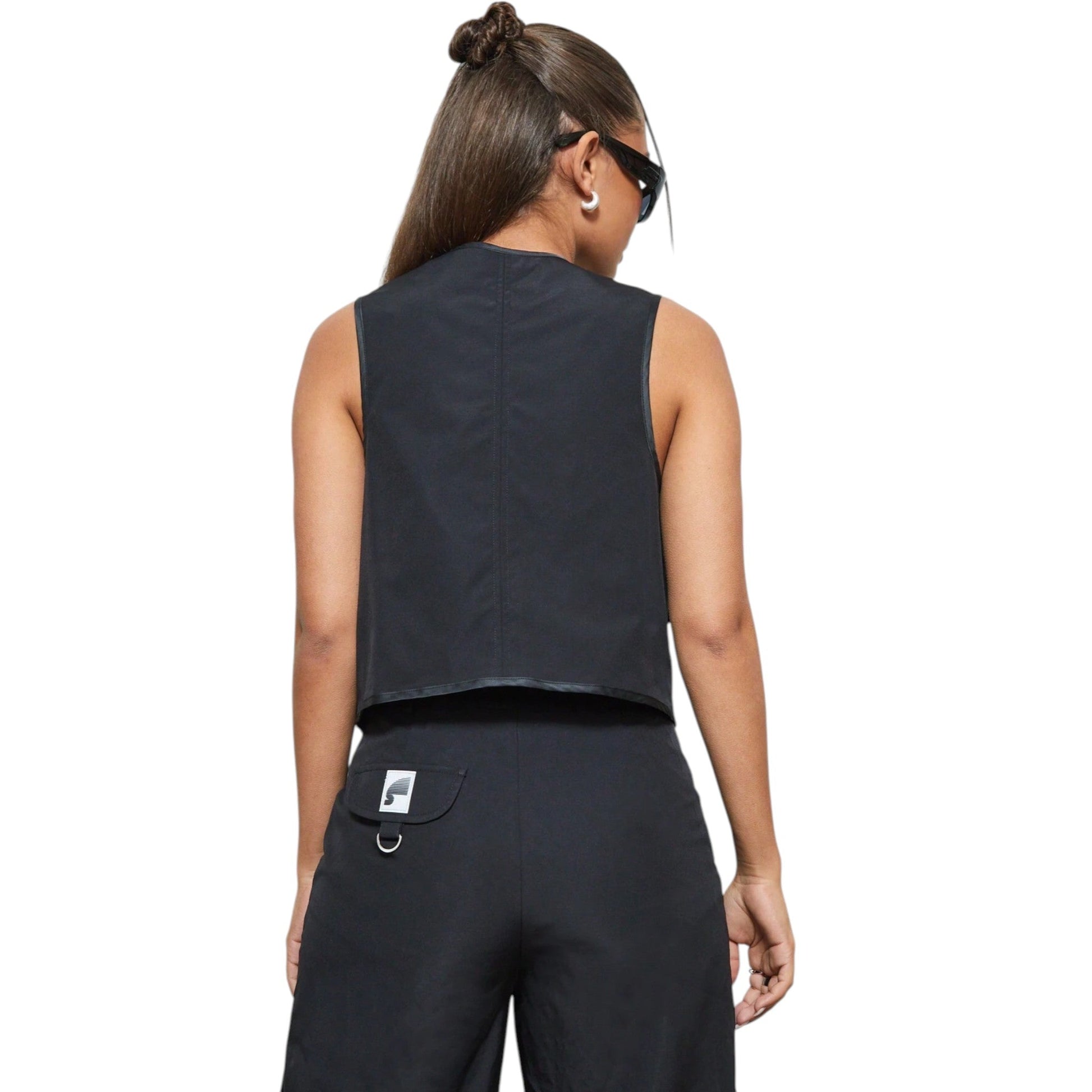 Címke nélküli, fekete, cipzáras, több zsebes, crop top hosszúságú mellény.