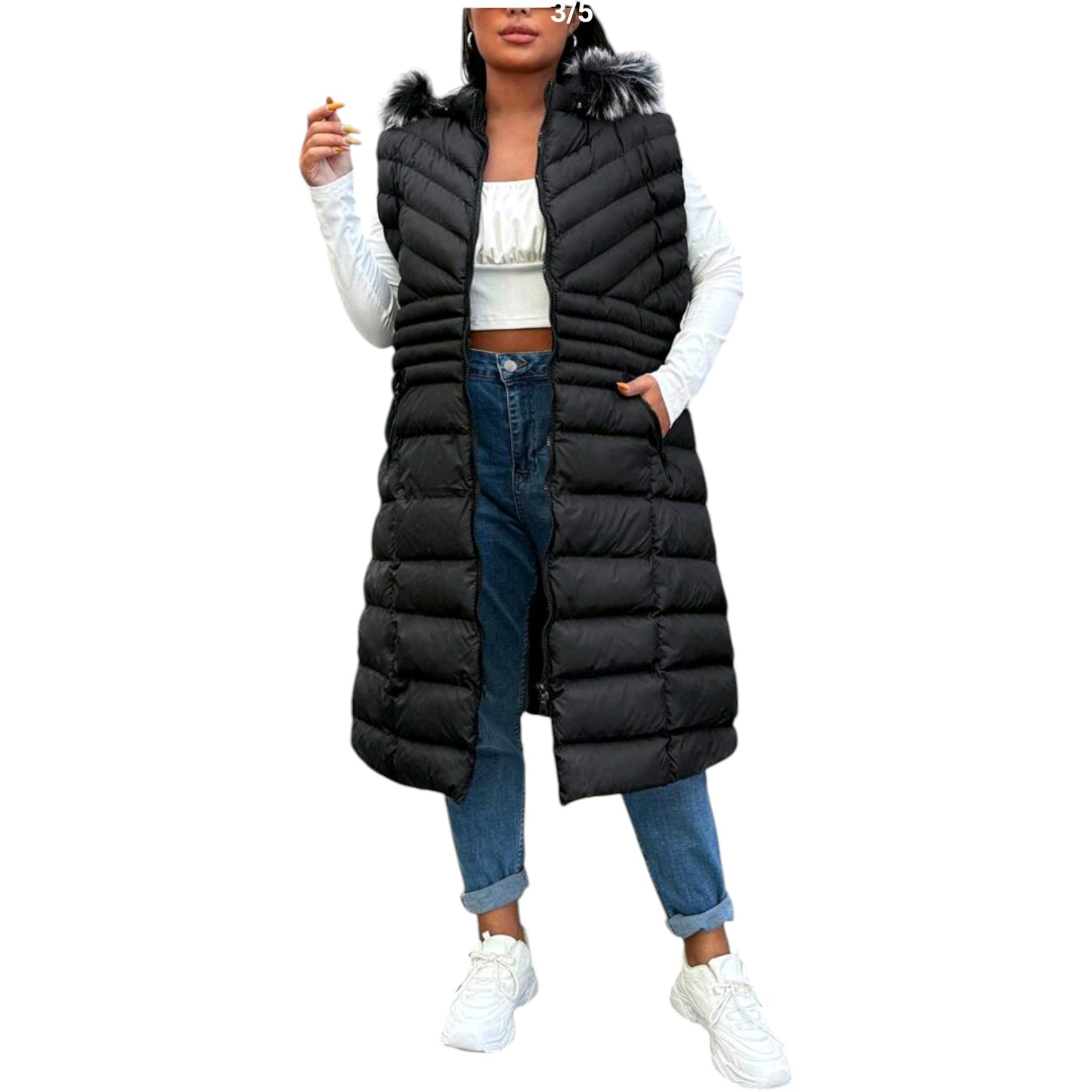 Címke nélküli, fekete, hosszú steppelt mellény, kapucnival, műszőrme szegéllyel a kapucnin, elöl cipzárral, V-alakú steppeléssel a felső részen.