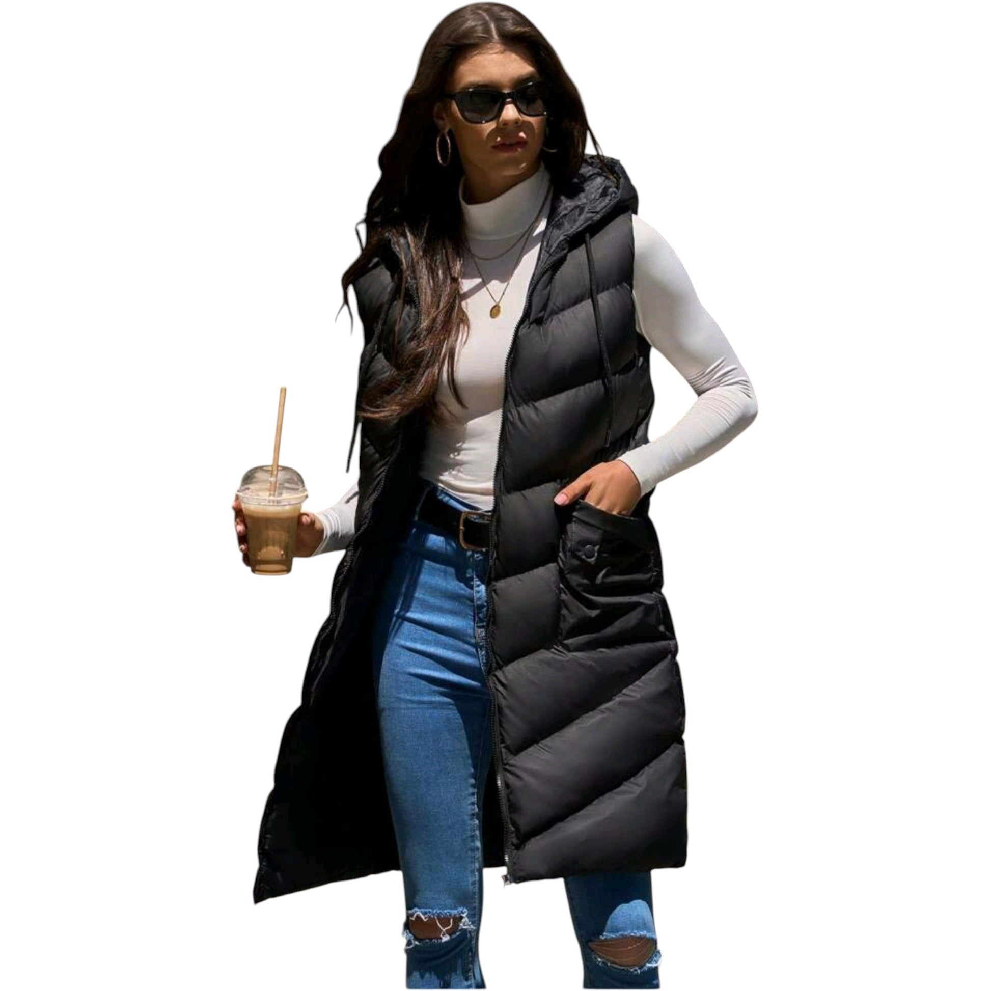 Címke nélküli, fekete, hosszú, térd alatti steppelt mellény, kapucnival, elöl cipzárral, V-alakú steppelés.