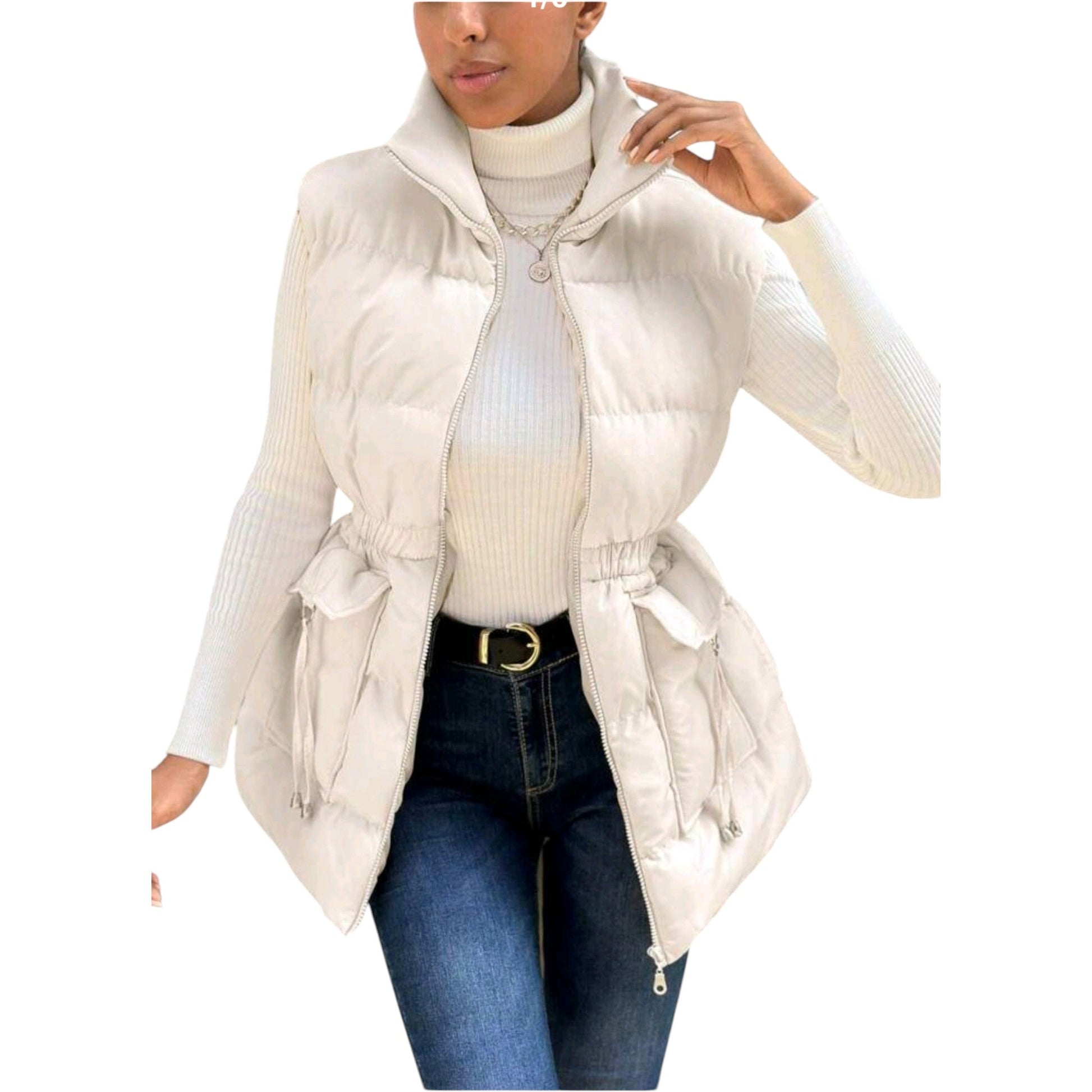 Címke nélküli, fehér, pufi mellény, magas álló gallérral, elöl cipzáros, elöl húzott zsebfedővel ellátott zseb díszítéssel, derékban húzott, gumis megoldással.