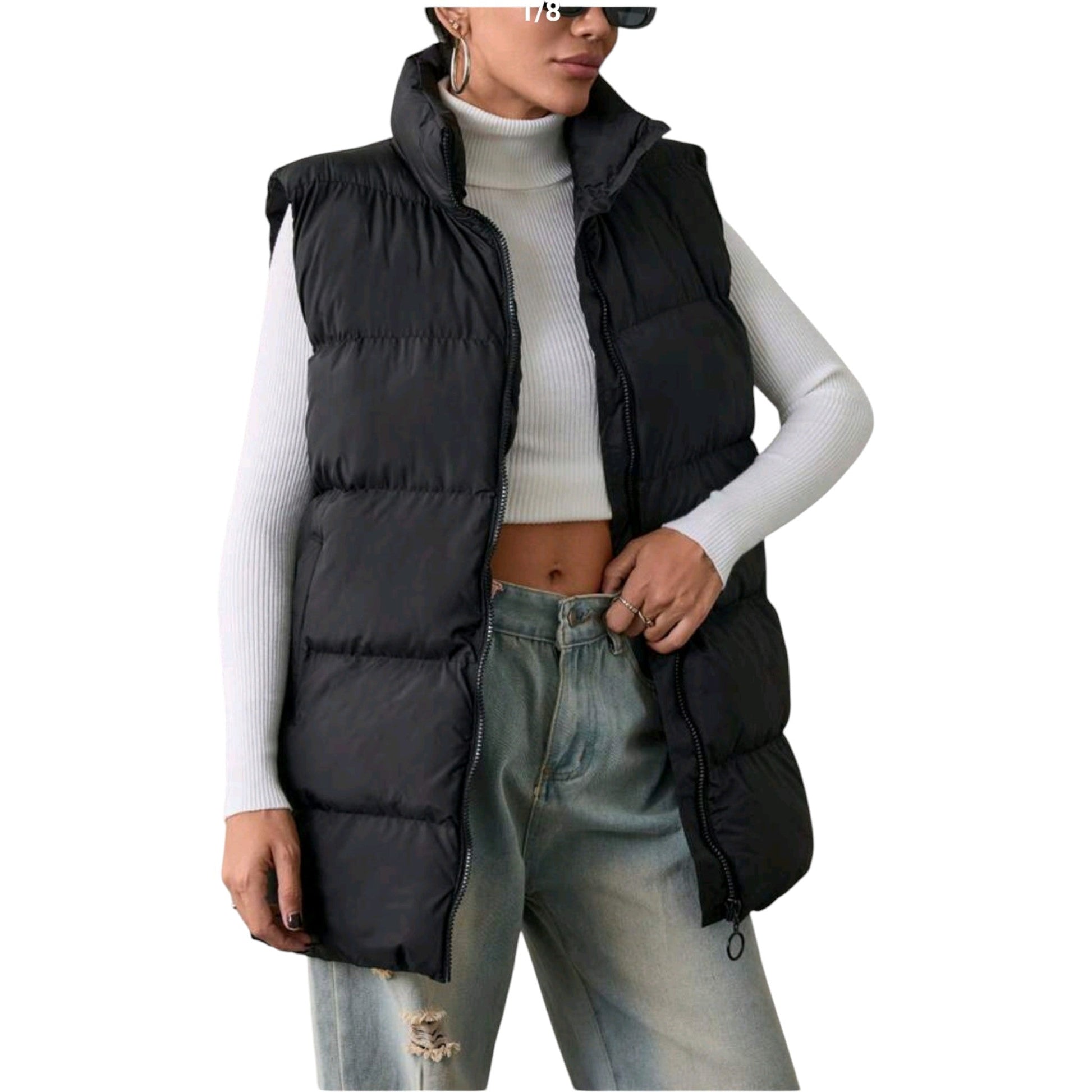 Címke nélküli, fekete, rövid, pufi mellény, elöl végig cipzáros, magas álló gallérral, vízszintes steppeléssel.