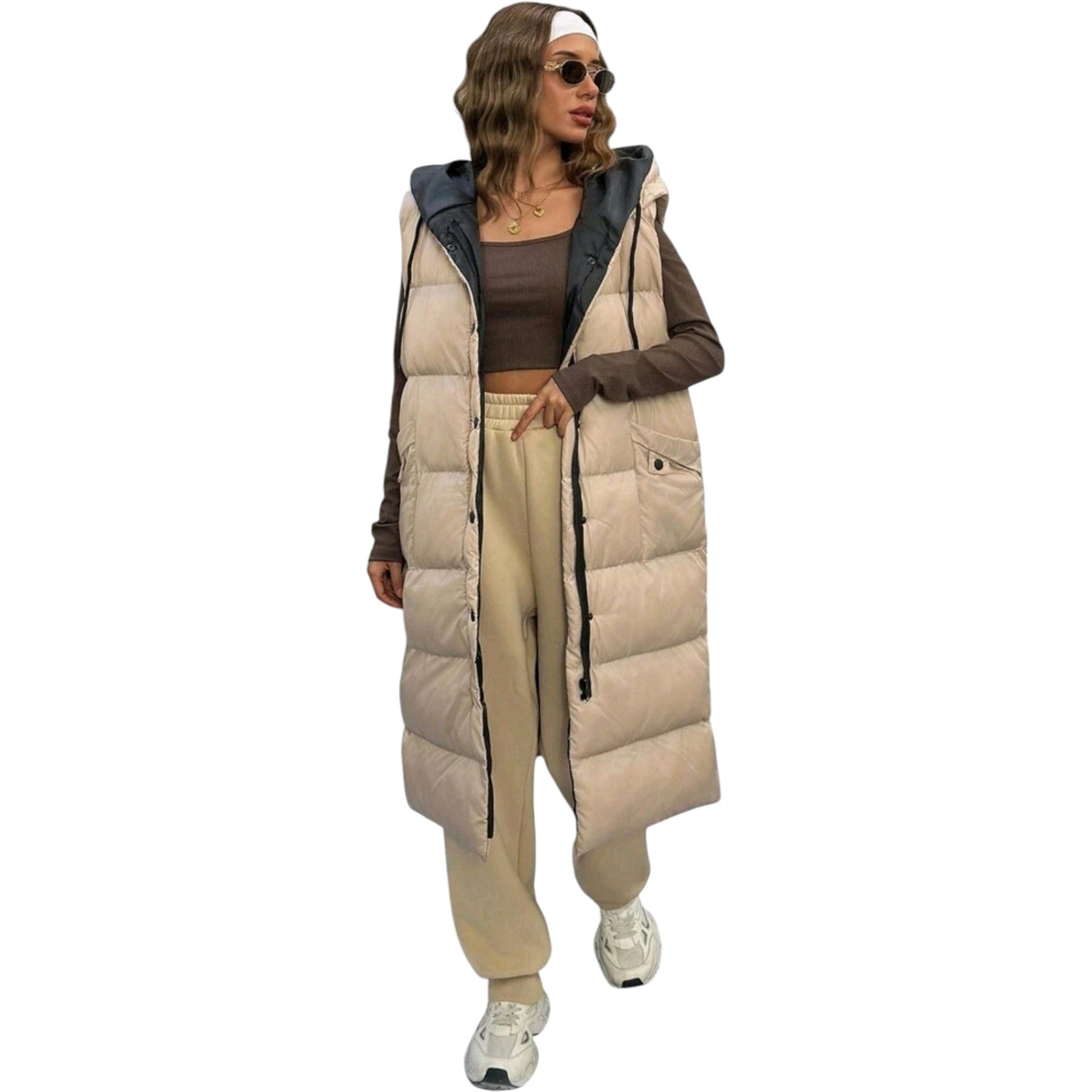Címke nélküli, bézs, hosszú, pufi mellény, fix kapucnival, vízszintes steppeléssel.